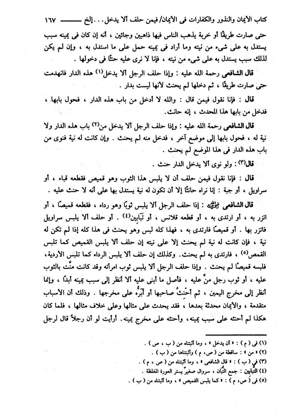 قَالَ الشَّافِعِيُّ : رحمه الله تعالى : وَلَوْ نَوَى أَنْ لاَ يَدْخُلَ الدَّارَ حَنِثَ ( قَالَ ) : فَإِنَّا نَقُولُ فِيمَنْ حَلَفَ أَنْ لاَ يَلْبَسَ هَذَا الثَّوْبَ وَهُوَ قَمِيصٌ فَقَطَعَهُ قَبَاءً , أَوْ سَرَاوِيلَ , أَوْ جُبَّةً إنَّا نَرَاهُ حَانِثًا إلَّا أَنْ تَكُونَ لَهُ نِيَّةٌ يُسْتَدَلُّ بِهَا عَلَى أَنَّهُ لاَ حِنْثَ عَلَيْهِ
