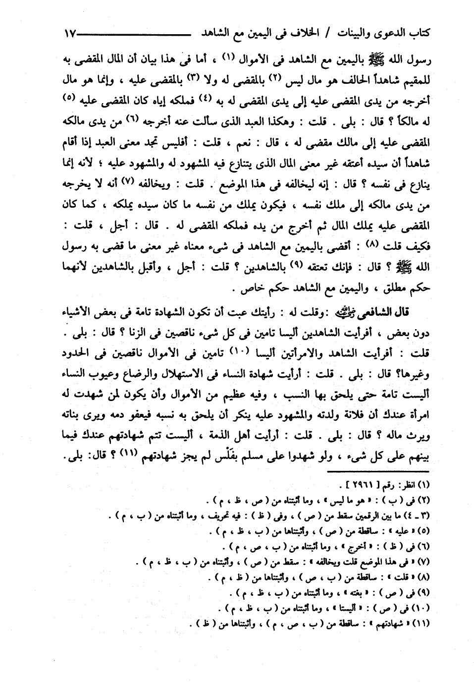 قَالَ الشَّافِعِيُّ : رحمه الله تعالى : وَقُلْت لَهُ رَأَيْتُك عِبْت أَنْ تَكُونَ الشَّهَادَةُ تَامَّةً فِي بَعْضِ الْأَشْيَاءِ دُونَ بَعْضٍ أَفَرَأَيْت الشَّاهِدَيْنِ أَلَيْسَا تَامَّيْنِ فِي كُلِّ شَيْءٍ نَاقِصَيْنِ فِي الزِّنَا ؟ قَالَ بَلَى . قُلْت أَفَرَأَيْت الشَّاهِدَ وَالِامْرَأَتَيْنِ أَلَيْسَا تَامَّيْنِ فِي الْأَمْوَالِ نَاقِصَيْنِ فِي الْحُدُودِ وَغَيْرِهَا ؟ قَالَ : بَلَى قُلْت أَرَأَيْت شَهَادَةَ النِّسَاءِ فِي الِاسْتِهْلاَلِ وَالرَّضَاعِ وَعُيُوبِ النِّسَاءِ أَلَيْسَتْ تَامَّةً حَتَّى يُلْحَقَ بِهَا النَّسَبُ وَفِيهِ عَظِيمٌ مِنْ الْأَمْوَالِ وَأَنْ يَكُونَ لِمَنْ شَهِدَتْ لَهُ امْرَأَةٌ عِنْدَك أَنَّ فُلاَنَةَ وَلَدَتْهُ , وَالْمَشْهُودُ عَلَيْهِ يُنْكِرُ أَنْ يَلْحَقَ بِهِ نَسَبُهُ فَيَعْفُو دَمَهُ وَيَرَى بَنَاتِهِ وَيَرِثَ مَالَهُ ؟ قَالَ : بَلَى قُلْت أَرَيْت أَهْلَ الذِّمَّةِ أَلَيْسَتْ تَتِمُّ شَهَادَتُهُمْ عِنْدَك فِيمَا بَيْنَهُمْ عَلَى كُلِّ شَيْءٍ .