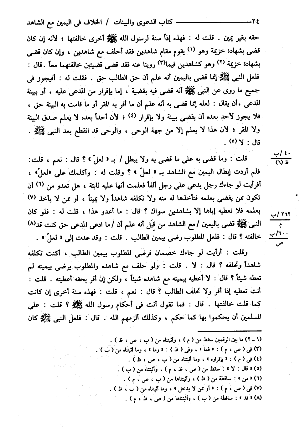 حَقَّهُ بِغَيْرِ يَمِينٍ , قُلْت لَهُ : فَهَذِهِ إذًا سُنَّةٌ لِرَسُولِ اللَّهِ - صلى الله عليه وسلم - أُخْرَى خَالَفْتهَا ; لِأَنَّهُ إنْ كَانَ قَضَى بِشَهَادَةِ خُزَيْمَةَ وَهُوَ يَقُومُ مَقَامَ شَاهِدَيْنِ فَقَدْ أَحْلَفَ مَعَ شَاهِدَيْنِ وَإِنْ كَانَ قَضَى بِشَهَادَةِ خُزَيْمَةَ وَهُوَ كَشَاهِدَيْنِ فِيمَا رَوَيْنَا عَنْهُ فَقَدْ قَضَى قَضِيَّتَيْنِ خَالَفْتهمَا مَعًا . قَالَ فَلَعَلَّ النَّبِيَّ - صلى الله عليه وسلم - إنَّمَا قَضَى بِالْيَمِينِ أَنَّهُ عَلِمَ أَنَّ حَقَّ الطَّالِبِ حَقٌّ فَقُلْت لَهُ : أَفَيَجُوزُ فِي جَمِيعِ مَا رُوِيَ عَنْ النَّبِيِّ - صلى الله عليه وسلم - أَنَّهُ قَضَى فِيهِ بِقَضِيَّةٍ إمَّا بِإِقْرَارٍ مِنْ الْمُدَّعَى عَلَيْهِ , أَوْ بِبَيِّنَةِ الْمُدَّعِي أَنْ يُقَالَ لَعَلَّهُ إنَّمَا قَضَى بِهِ أَنَّهُ عَلِمَ أَنَّ مَا أَقَرَّ بِهِ الْمُقِرُّ , أَوْ مَا قَامَتْ بِهِ الْبَيِّنَةُ حَقٌّ فَلاَ يَجُوزُ لِأَحَدٍ بَعْدَهُ أَنْ يَقْضِيَ بِبَيِّنَةٍ وَلاَ بِإِقْرَارٍ ; لِأَنَّ أَحَدًا بَعْدَهُ لاَ يَعْلَمُ صِدْقَ الْبَيِّنَةِ وَلاَ الْمُقِرِّ ; لِأَنَّ هَذَا لاَ يُعْلَمُ إلَّا مِنْ جِهَةِ الْوَحْيِ , وَالْوَحْيُ قَدْ انْقَطَعَ بَعْدَ النَّبِيِّ - صلى الله عليه وسلم - قَالَ : لاَ , قُلْت : وَمَا قَضَى بِهِ عَلَى مَا قَضَى بِهِ وَلاَ يَبْطُلُ بِلَعَلَّ ؟ قَالَ نَعَمْ , قُلْت : فَلِمَ أَرَدْت إبْطَالَ الْيَمِينِ مَعَ الشَّاهِدِ بِلَعَلَّ ؟ وَقُلْت لَهُ : وَأُكَلِّمُك عَلَى لَعَلَّ أَفَرَأَيْت لَوْ جَاءَك رَجُلٌ يَدَّعِي عَلَى رَجُلٍ أَلْفًا فَعَلِمْت أَنَّهَا عَلَيْهِ ثَابِتَةٌ هَلْ تَعْدُو مِنْ أَنْ تَكُونَ مِمَّنْ يَقْضِي بِعِلْمِهِ فَتَأْخُذَهَا لَهُ مِنْهُ وَلاَ تُكَلِّفَهُ شَاهِدًا وَلاَ يَمِينًا , أَوْ مِمَّنْ لاَ يَأْخُذُ بِعِلْمِهِ فَلاَ تُعْطِيه إيَّاهَا إلَّا بِشَاهِدَيْنِ سِوَاك ؟ قَالَ مَا أَعْدُو هَذَا , قُلْت لَهُ : فَلَوْ كَانَ النَّبِيُّ - صلى الله عليه وسلم - قَضَى بِالْيَمِينِ مَعَ الشَّاهِدِ مِنْ قِبَلِ أَنَّهُ عَلِمَ أَنَّ مَا ادَّعَى الْمُدَّعِي حَقٌّ كُنْت خَالَفْته ؟ قَالَ فَلَعَلَّ الْمَطْلُوبَ رَضِيَ بِيَمِينِ الطَّالِبِ . قُلْت : وَقَدْ عُدْت إلَى لَعَلَّ , وَقُلْت : أَرَأَيْت لَوْ جَاءَك خَصْمَانِ فَرَضِيَ الْمَطْلُوبُ بِيَمِينِ الطَّالِبِ أَكُنْت تُكَلِّفُهُ شَاهِدًا وَتُحَلِّفُهُ ؟ قَالَ : لاَ , قُلْت : وَلَوْ حَلَفَ مَعَ شَاهِدِهِ , وَالْمَطْلُوبُ يَرْضَى بِيَمِينِهِ لَمْ تُعْطِهِ شَيْئًا قَالَ لاَ أُعْطِيه بِيَمِينِهِ مَعَ شَاهِدِهِ شَيْئًا وَلَكِنْ إنْ أَقَرَّ بِحَقِّهِ أَعْطَيْته . قُلْت : أَنْتَ تُعْطِيه إذَا أَقَرَّ وَلاَ تُحَلِّفُ الطَّالِبَ ؟ قَالَ نَعَمْ , قُلْت : فَهَذِهِ سُنَّةٌ أُخْرَى إنْ كَانَتْ كَمَا قُلْت خَالَفْتهَا . قَالَ فَمَا تَقُولُ أَنْتَ فِي أَحْكَامِ رَسُولِ اللَّهِ - صلى الله عليه وسلم - ؟ قُلْت : عَلَى الْمُسْلِمِينَ أَنْ يَحْكُمُوا بِهَا كَمَا حَكَمَ , وَكَذَلِكَ أَلْزَمَهُمْ اللَّهُ . قَالَ فَلَعَلَّ النَّبِيَّ - صلى الله عليه وسلم - كَانَ @