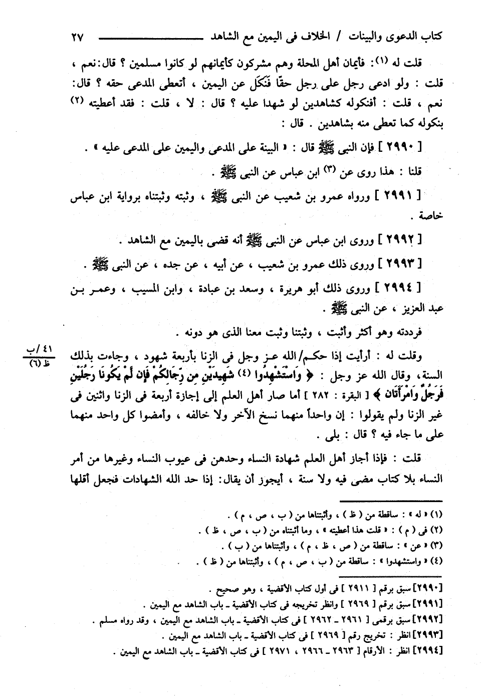 قُلْت لَهُ : فَأَيْمَانُ أَهْلِ الْمَحَلَّةِ وَهُمْ مُشْرِكُونَ كَأَيْمَانِهِمْ لَوْ كَانُوا مُسْلِمِينَ ؟ قَالَ نَعَمْ , قُلْت : وَلَوْ ادَّعَى رَجُلٌ عَلَى رَجُلٍ حَقًّا فَنَكَلَ عَنْ الْيَمِينِ أَتُعْطِي الْمُدَّعِي حَقَّهُ ؟ قَالَ نَعَمْ , قُلْت أَفَنُكُولُهُ كَشَاهِدَيْنِ لَوْ شَهِدَا عَلَيْهِ ؟ قَالَ لاَ , قُلْت فَقَدْ أَعْطَيْته بِنُكُولِهِ كَمَا تُعْطِي مِنْهُ بِشَاهِدَيْنِ ؟ قَالَ فَإِنَّ النَّبِيَّ - صلى الله عليه وسلم - قَالَ : ? الْبَيِّنَةُ عَلَى الْمُدَّعِي , وَالْيَمِينُ عَلَى الْمُدَّعَى عَلَيْهِ ? قُلْنَا هَذَا رُوِيَ عَنْ ابْنِ عَبَّاسٍ عَنْ النَّبِيِّ - صلى الله عليه وسلم - وَرَوَاهُ عَمْرُو بْنُ شُعَيْبٍ عَنْ النَّبِيِّ - صلى الله عليه وسلم - وَثَبَّتَهُ وَثَبَّتْنَاهُ بِرِوَايَةِ ابْنِ عَبَّاسٍ خَاصَّةً وَرَوَى ابْنُ عَبَّاسٍ : ? عَنْ النَّبِيِّ - صلى الله عليه وسلم - أَنَّهُ قَضَى بِالْيَمِينِ مَعَ الشَّاهِدِ ? وَرَوَى ذَلِكَ عَمْرُو بْنُ شُعَيْبٍ عَنْ أَبِيهِ عَنْ جَدِّهِ عَنْ النَّبِيِّ - صلى الله عليه وسلم - وَرَوَى ذَلِكَ أَبُو هُرَيْرَةَ وَسَعْدُ بْنُ عُبَادَةَ وَابْنُ الْمُسَيِّبِ وَعُمَرُ بْنُ عَبْدِ الْعَزِيزِ عَنْ النَّبِيِّ - صلى الله عليه وسلم - فَرَدَدْته وَهُوَ أَكْثَرُ وَأَثْبَتُ وَثَبَّتْنَا وَثَبَتَ مَعَنَا الَّذِي هُوَ دُونَهُ , وَقُلْت لَهُ أَرَأَيْت إذْ حَكَمَ اللَّهُ عَزَّ وَجَلَّ فِي الزِّنَا بِأَرْبَعَةِ شُهُودٍ وَجَاءَتْ بِذَلِكَ السُّنَّةُ وَقَالَ اللَّهُ عَزَّ وَجَلَّ : ? شَهِيدَيْنِ مِنْ رِجَالِكُمْ فَإِنْ لَمْ يَكُونَا رَجُلَيْنِ فَرَجُلٌ وَامْرَأَتَانِ ? أَمَا صَارَ أَهْلُ الْعِلْمِ إلَى إجَازَةِ أَرْبَعَةٍ فِي الزِّنَا وَاثْنَيْنِ فِي غَيْرِ الزِّنَا وَلَمْ يَقُولُوا أَنَّ وَاحِدًا مِنْهُمَا نَسَخَ الْآخَرَ وَلاَ خَالَفَهُ وَأَمْضُوا كُلَّ وَاحِدٍ مِنْهُمَا عَلَى مَا جَاءَ فِيهِ ؟ قَالَ بَلَى قُلْت : فَإِذَا أَجَازَ أَهْلُ الْعِلْمِ شَهَادَةَ النِّسَاءِ وَحْدَهُنَّ فِي عُيُوبِ النِّسَاءِ وَغَيْرِهَا مِنْ أَمْرِ النِّسَاءِ بِلاَ كِتَابٍ مَضَى فِيهِ وَلاَ سُنَّةٍ أَيَجُوزُ أَنْ يُقَالَ إذْ حَدَّ اللَّهُ الشَّهَادَاتِ فَجَعَلَ أَقَلَّهَا@