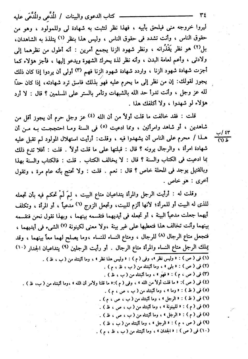 لِيَرَوْا خُرُوجَهُ مِنِّي فَيَلْحَقُ بِأَبِيهِ فَهَذَا نَظَرٌ لِنُثْبِتَ بِهِ شَهَادَةً لِي وَلِلْمَوْلُودِ وَهُوَ مِنْ حُقُوقِ النَّاسِ وَأَنْتَ تُشَدِّدُ فِي حُقُوقِ النَّاسِ وَلَيْسَ هَذَا بِنَظَرٍ يَتَلَذَّذُ بِهِ الشَّاهِدَانِ , بَلْ هُوَ نَظَرٌ يَقْذُرَانِهِ وَنَظَرُ شُهُودِ الزِّنَا يَجْمَعُ أَمْرَيْنِ أَنَّهُ أَطْوَلُ مِنْ نَظَرِهِمَا إلَى وِلاَدَتِي وَأَعَمُّ لِعَامَّةِ الْبَدَنِ وَأَنَّهُ نَظَرُ لَذَّةٍ يُحَرِّكُ الشَّهْوَةَ وَيَدْعُو إلَيْهَا , فَأَجِزْ هَؤُلاَءِ كَمَا أَجَزْت شَهَادَةَ شُهُودِ الزِّنَا وَارْدُدْ شَهَادَةَ شُهُودِ الزِّنَا فَهُمْ أَوْلَى أَنْ يُرَدُّوا إذَا كَانَ ذَلِكَ يَجُوزُ لِقَوْلِك إنَّ مَنْ نَظَرَ إلَى مَا يَحْرُمُ عَلَيْهِ فَهُوَ بِذَلِكَ فَاسِقٌ تُرَدُّ شَهَادَتُهُ إذَا كَانَ حَدًّا لِلَّهِ عَزَّ وَجَلَّ وَأَنْتَ تَدْرَأُ حَدَّ اللَّهِ بِالشُّبُهَاتِ وَتَأْمُرُ بِالسِّتْرِ عَلَى الْمُسْلِمِينَ , قَالَ لاَ أَرُدُّ هَؤُلاَءِ لَوْ شَهِدُوا وَلاَ أُكَلِّفُك هَذَا . قُلْت فَقَدْ خَالَفْت مَا قُلْت أَوَّلاً مِنْ أَنَّ اللَّهَ عَزَّ وَجَلَّ حَرَّمَ أَنْ يَجُوزَ أَقَلُّ مِنْ شَاهِدَيْنِ , أَوْ شَاهِدٍ وَامْرَأَتَيْنِ وَمِمَّا ادَّعَيْت فِي السُّنَّةِ وَمَا احْتَجَجْت بِهِ مِنْ أَنَّ هَذَا مُحَرَّمٌ عَلَى النَّاسِ أَنْ يَشْهَدُوا فِيهِ , وَقُلْت أَرَأَيْت اسْتِهْلاَلَ الْمَوْلُودِ , لَمْ تُقْبَلْ عَلَيْهِ شَهَادَةُ امْرَأَةٍ وَالرِّجَالُ يَرَوْنَهُ قَالَ قَبِلْتهَا عَلَى مَا قُلْت أَوَّلاً قُلْت : أَفَلاَ تَدَعُ ذَلِكَ بِمَا ادَّعَيْت فِي الْكِتَابِ وَالسُّنَّةِ ؟ قَالَ لاَ يُخَالِفُ الْكِتَابَ . قُلْت فَالْكِتَابُ وَالسُّنَّةُ بِهَذَا وَبِالْقَتِيلِ يُوجَدُ فِي الْمَحَلَّةِ خَاصٌّ ؟ قَالَ نَعَمْ : قُلْت لاَ تَحْتَجَّ بِأَنَّهُ عَامٌّ مَرَّةً وَتَقُولُ أُخْرَى هُوَ خَاصٌّ وَقُلْت لَهُ أَرَأَيْت الرَّجُلَ , وَالْمَرْأَةَ يَتَدَاعَيَانِ مَتَاعَ الْبَيْتِ لِمَ لَمْ تَحْكُمْ فِيهِ بِأَنْ تَجْعَلَهُ لِلَّذِي لَهُ الْبَيْتُ , أَوْ لِلْمَرْأَةِ ; لِأَنَّهَا أَلْزَمُ لِلْبَيْتِ وَتَجْعَلُ الزَّوْجَ مُدَّعِيًا , أَوْ الْمَرْأَةَ وَتُكَلِّفُ أَيَّهمَا جَعَلْت مُدَّعِيًا الْبَيِّنَةَ , أَوْ تَجْعَلُهُ فِي أَيْدِيهِمَا فَتُقَسِّمُهُ بَيْنَهُمَا وَبِهَذَا نَقُولُ نَحْنُ فَنُقَسِّمُهُ بَيْنَهُمَا وَأَنْتَ تُخَالِفُ هَذَا فَتُعْطِيهَا عَلَى غَيْرِ بَيِّنَةٍ وَلاَ مَعْنَى لِكَيْنُونَةِ الشَّيْءِ فِي أَيْدِيهِمَا فَتَجْعَلُ مَتَاعَ الرِّجَالِ لِلرِّجَالِ وَمَتَاعَ النِّسَاءِ لِلنِّسَاءِ وَمَا يَصْلُحُ لَهُمَا مَعًا بَيْنَهُمَا , وَقَدْ يَمْلِكُ الرَّجُلُ مَتَاعَ النِّسَاءِ , وَالْمَرْأَةُ مَتَاعَ الرِّجَالِ , أَوْ أَوَرَأَيْت الرَّجُلَيْنِ يَتَدَاعَيَانِ الْجِدَارَ@