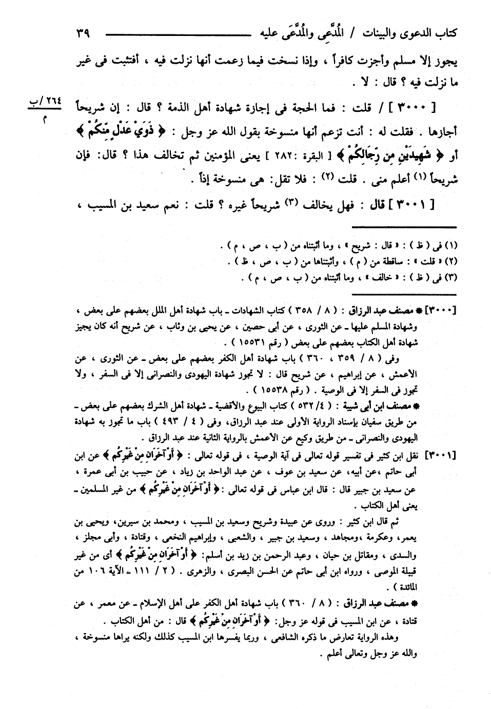 يَجُوزَ إلَّا مُسْلِمٌ وَأَجَزْت كَافِرًا , وَإِذَا نُسِخَتْ فِيمَا زَعَمْت أَنَّهَا نَزَلَتْ فِيهِ أَفَتَثْبُت فِي غَيْرِ مَا نَزَلَتْ فِيهِ ؟ قَالَ : لاَ قُلْت فَمَا الْحُجَّةُ فِي إجَازَةِ شَهَادَةِ أَهْلِ الذِّمَّةِ قَالَ إنَّ شُرَيْحًا أَجَازَهَا فَقُلْت لَهُ أَنْتَ تَزْعُمُ أَنَّهَا مَنْسُوخَةٌ بِقَوْلِ اللَّهِ عَزَّ وَجَلَّ : ? ذَوَيْ عَدْلٍ مِنْكُمْ ? , أَوْ : ? شَهِيدَيْنِ مِنْ رِجَالِكُمْ ? يَعْنِي الْمُؤْمِنِينَ , ثُمَّ تُخَالِفُ هَذَا . قَالَ فَإِنَّ شُرَيْحًا أَعْلَمُ مِنِّي : قُلْت فَلاَ تَقُلْ هِيَ مَنْسُوخَةٌ إذَا قَالَ فَهَلْ يُخَالِفُ شُرَيْحًا غَيْرُهُ ؟ قُلْت : نَعَمْ سَعِيدُ بْنُ الْمُسَيِّبِ@