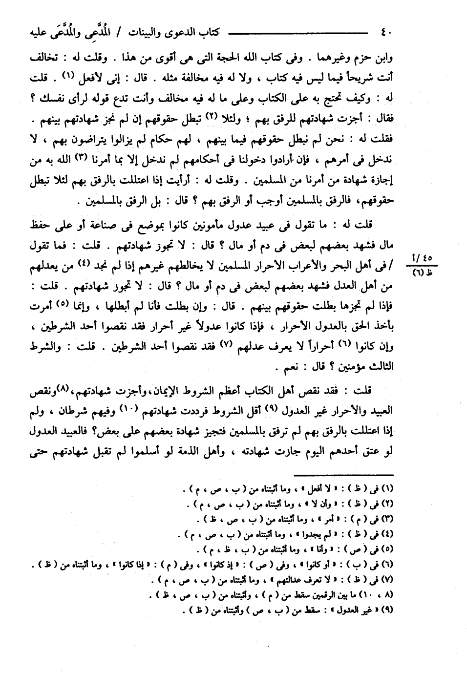 وَابْنُ حَزْمٍ وَغَيْرهمَا وَفِي كِتَابِ اللَّهِ الْحُجَّةُ الَّتِي هِيَ أَقْوَى مِنْ هَذَا وَقُلْت لَهُ تُخَالِفُ أَنْتَ شُرَيْحًا فِيمَا لَيْسَ فِيهِ كِتَابٌ وَلاَ لَهُ فِيهِ مُخَالِفٌ مِثْلُهُ قَالَ إنِّي لاََفْعَلُ قُلْت لَهُ وَكَيْفَ تَحْتَجُّ بِهِ عَلَى الْكِتَابِ وَعَلَى مَا لَهُ فِيهِ مُخَالِفٌ وَأَنْتَ تَدَعُ قَوْلَهُ لِرَأْيِ نَفْسِك؟ فَقَالَ أَجَزْت شَهَادَتَهُمْ لِلرِّفْقِ بِهِمْ لِئَلَّا تَبْطُلَ حُقُوقُهُمْ إنْ لَمْ نُجِزْ شَهَادَتَهُمْ بَيْنَهُمْ. فَقُلْت لَهُ نَحْنُ لَمْ نُبْطِلْ حُقُوقَهُمْ فِيمَا بَيْنَهُمْ لَهُمْ حُكَّامٌ لَمْ يَزَالُوا يَتَرَاضَوْنَ بِهِمْ لاَ نَدْخُلُ فِي أَمْرِهِمْ فَإِنْ أَرَادُوا دُخُولَنَا فِي أَحْكَامِهِمْ لَمْ نَدْخُلْ إلَّا بِمَا أَمَرَنَا اللَّهُ تَعَالَى بِهِ مِنْ إجَازَةِ شَهَادَةِ مَنْ أَمَّرْنَا مِنْ الْمُسْلِمِينَ وَقُلْت لَهُ: أَرَأَيْت إذَا اعْتَلَلْت بِالرِّفْقِ بِهِمْ لِئَلَّا تَبْطُلَ حُقُوقُهُمْ فَالرِّفْقُ بِالْمُسْلِمِينَ يُلْتَعَنُ , أَوْ الرِّفْقُ بِهِمْ؟ (قَالَ): بَلْ الرِّفْقُ بِالْمُسْلِمِينَ. قُلْت لَهُ: مَا تَقُولُ فِي عَبِيدٍ عُدُولٍ مَأْمُونِينَ كَانُوا بِمَوْضِعٍ فِي صِنَاعَةٍ , أَوْ عَلَى حِفْظِ مَالٍ فَشَهِدَ بَعْضُهُمْ لِبَعْضٍ فِي دَمٍ , أَوْ مَالٍ؟ قَالَ لاَ تَجُوزُ شَهَادَتُهُمْ قُلْت: فَمَا تَقُولُ فِي أَهْلِ الْبَحْرِ , وَالْأَعْرَابِ الْأَحْرَارِ الْمُسْلِمِينَ لاَ يُخَالِطُهُمْ غَيْرُهُمْ إذَا لَمْ نَجِدْ مَنْ يَعْدِلُهُمْ مِنْ أَهْلِ الْعَدْلِ فَشَهِدَ بَعْضُهُمْ لِبَعْضٍ فِي دَمٍ , أَوْ مَالٍ؟ قَالَ لاَ تَجُوزُ شَهَادَتُهُمْ قُلْت فَإِذَا لَمْ تُجِزْهَا بَطَلَتْ حُقُوقُهُمْ بَيْنَهُمْ (قَالَ): وَإِنْ بَطَلَتْ , فَأَنَا لَمْ أُبْطِلْهَا وَإِنَّمَا أَمَرْت بِأَخْذِ الْحَقِّ بِالْعُدُولِ الْأَحْرَارِ فَإِذَا كَانُوا عُدُولاً غَيْرَ أَحْرَارٍ فَقَدْ نَقَصُوا أَحَدَ الشَّرْطَيْنِ , أَوْ كَانُوا أَحْرَارًا لاَ يُعْرَفُ عَدْلُهُمْ فَقَدْ نَقَصُوا أَحَدَ الشَّرْطَيْنِ قُلْت وَالشَّرْطُ الثَّالِثُ مُؤْمِنِينَ؟ قَالَ نَعَمْ: قُلْت فَقَدْ نَقَصَ أَهْلُ الْكِتَابِ أَعْظَمَ الشُّرُوطِ الْإِيمَانُ وَأَجَزْت شَهَادَتَهُمْ وَنَقَصَ الْعَبِيدُ , وَالْأَحْرَارُ أَقَلَّ الشُّرُوطِ فَرَدَدْت شَهَادَتَهُمْ وَفِيهِمْ شَرْطَانِ وَلِمَ إذَا اعْتَلَلْت بِالرِّفْقِ بِهِمْ لَمْ تَرْفُقْ بِالْمُسْلِمِينَ فَتُجِيزُ شَهَادَةَ بَعْضِهِمْ عَلَى بَعْضٍ فَالْعَبِيدُ الْعُدُولُ لَوْ عَتَقَ أَحَدُهُمْ الْيَوْمَ جَازَتْ شَهَادَتُهُ وَأَهْلُ الذِّمَّةِ لَوْ أَسْلَمُوا لَمْ تُقْبَلْ شَهَادَتُهُمْ حَتَّى@