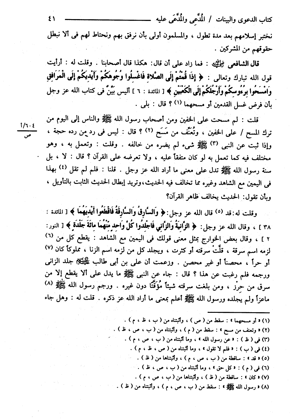 وَقُلْت: أَرَأَيْت قَوْلَ اللَّهِ تَبَارَكَ وَتَعَالَى: ? إذَا قُمْتُمْ إلَى الصَّلاَةِ فَاغْسِلُوا وُجُوهَكُمْ وَأَيْدِيَكُمْ إلَى الْمَرَافِقِ وَامْسَحُوا بِرُءُوسِكُمْ وَأَرْجُلِكُمْ إلَى الْكَعْبَيْنِ ? أَلَيْسَ بَيَّنَ فِي كِتَابِ اللَّهِ عَزَّ وَجَلَّ بِأَنْ فَرَضَ غَسْلَ الْقَدَمَيْنِ , أَوْ مَسْحَهُمَا؟ قَالَ بَلَى: قُلْت لِمَ مَسَحْت عَلَى الْخُفَّيْنِ وَمِنْ أَصْحَابِ رَسُولِ اللَّهِ - صلى الله عليه وسلم - وَالنَّاسِ إلَى الْيَوْمِ مَنْ تَرَكَ الْمَسْحَ عَلَى الْخُفَّيْنِ وَيُعَنِّفُ مَنْ مَسَحَ؟ قَالَ لَيْسَ فِي رَدِّ مَنْ رَدَّهُ حُجَّةٌ , وَإِذَا ثَبَتَ عَنْ النَّبِيِّ - صلى الله عليه وسلم - شَيْءٌ لَمْ يَضُرَّهُ مَنْ خَالَفَهُ. وَقُلْت وَنَعْمَلُ بِهِ وَهُوَ مُخْتَلَفٌ فِيهِ كَمَا نَعْمَلُ بِهِ لَوْ كَانَ مُتَّفَقًا عَلَيْهِ وَلاَ نَعْرِضُهُ عَلَى الْقُرْآنِ؟ قَالَ لاَ , بَلْ سُنَّةُ رَسُولِ اللَّهِ - صلى الله عليه وسلم - تَدُلُّ عَلَى مَعْنَى مَا أَرَادَ اللَّهُ عَزَّ وَجَلَّ قُلْنَا فَلِمَ لاَ تَقُولُ بِهَذَا فِي الْيَمِينِ مَعَ الشَّاهِدِ وَغَيْرِهِ مِمَّا تُخَالِفُ فِيهِ الْحَدِيثَ وَتُرِيدُ إبْطَالَ الْحَدِيثِ الثَّابِتِ بِالتَّأْوِيلِ وَبِأَنْ تَقُولَ الْحَدِيثُ يُخَالِفُ ظَاهِرَ الْقُرْآنِ وَقُلْت لَهُ: قَالَ اللَّهُ عَزَّ وَجَلَّ: ? وَالسَّارِقُ وَالسَّارِقَةُ فَاقْطَعُوا أَيْدِيَهُمَا ? وَقَالَ اللَّهُ عَزَّ وَجَلَّ: ? الزَّانِيَةُ وَالزَّانِي فَاجْلِدُوا كُلَّ وَاحِدٍ مِنْهُمَا مِائَةَ جَلْدَةٍ ? وَقَالَ بَعْضُ الْخَوَارِجِ بِمِثْلِ مَعْنَى قَوْلِك فِي الْيَمِينِ مَعَ الشَّاهِدِ يُقْطَعُ كُلُّ مَنْ لَزِمَهُ اسْمُ سَرِقَةٍ قَلَّتْ سَرِقَتُهُ , أَوْ كَثُرَتْ وَيُجْلَدُ كُلُّ مَنْ لَزِمَهُ اسْمُ الزِّنَا مَمْلُوكًا كَانَ , أَوْ حُرًّا مُحْصَنًا , أَوْ غَيْرَ مُحْصَنٍ وَزَعَمْت أَنَّ عَلِيَّ بْنَ أَبِي طَالِبٍ رضي الله تعالى عنه جَلَدَ الزَّانِي وَرَجَمَهُ فَلِمَ رَغِبْت عَنْ هَذَا؟ قَالَ جَاءَ عَنْ النَّبِيِّ - صلى الله عليه وسلم - مَا يَدُلُّ عَلَى أَنْ لاَ يُقْطَعُ إلَّا مَنْ سَرِقَ مِنْ حِرْزٍ وَمَنْ بَلَغَتْ سَرِقَتُهُ شَيْئًا مُوَقَّتًا دُونَ غَيْرِهِ وَرَجَمَ مَاعِزًا وَلَمْ يَجْلِدْهُ وَرَسُولُ اللَّهِ - صلى الله عليه وسلم - أَعْلَمُ بِمَعْنَى مَا أَرَادَ اللَّهُ عَزَّ ذِكْرُهُ قُلْت لَهُ: وَهَلْ جَاءَ@