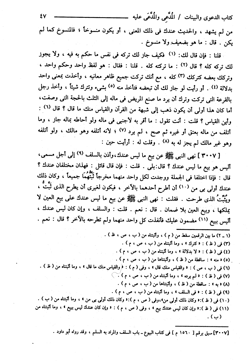 مَنْ لَمْ يَشْهَدُ الْحَدِيثَ عِنْدَك فِي ذَلِكَ الْمَعْنَى , أَوْ يَكُونُ مَنْسُوخًا فَالْمَنْسُوخُ كَمَا لَمْ يَكُنْ قَالَ مَا هُوَ بِضَعِيفٍ وَلاَ مَنْسُوخٍ قُلْنَا فَإِنْ قَالَ لَك فَكَيْفَ جَازَ لَك تَرْكُهُ فِي نَفْسِ مَا حَكَمَ بِهِ فِيهِ وَلاَ يَجُوزُ لَك تَرْكُهُ كُلِّهِ ؟ قَالَ مَا تَرَكْته كُلَّهُ , قُلْنَا فَقَالَ هُوَ لَفْظٌ وَاحِدٌ وَحُكْمٌ وَاحِدٌ وَتَرْكُك بَعْضَهُ كَتَرْكِك كُلَّهُ مَعَ أَنَّك تَرَكْت جَمِيعَ ظَاهِرِ مَعَانِيه وَأَخَذْت بِمَعْنًى وَاحِدٍ بِدَلاَلَةٍ , أَوْ رَأَيْت لَوْ جَازَ لَك أَنْ تُبَعِّضَهُ فَتَأْخُذَ مِنْهُ بِشَيْءٍ وَتَتْرُكَ شَيْئًا , وَأَخَذَ رَجُلٌ بِالْقُرْعَةِ الَّتِي تَرَكْت وَتَرَكَ أَنْ يَرُدَّ مَا صَنَعَ الْمَرِيضُ فِي مَالِهِ إلَى الثُّلُثِ بِالْحُجَّةِ الَّتِي وَصَفْت أَمَا كَانَ هَذَا أَوْلَى أَنْ يَكُونَ ذَهَبَ إلَى شُبْهَةٍ مِنْ الْقُرْآنِ , وَالْقِيَاسِ مِنْك قَالَ : وَأَيْنَ الْقِيَاسُ قُلْت : أَنْتَ تَقُولُ مَا أَقَرَّ بِهِ لِأَجْنَبِيٍّ فِي مَالِهِ , وَلَوْ أَحَاطَ بِمَالِهِ جَازَ وَمَا أُتْلِفَ مِنْ مَالِهِ بِعِتْقٍ , أَوْ غَيْرِهِ , ثُمَّ صَحَّ لَمْ يُرَدَّ ; لِأَنَّهُ أَتْلَفَهُ وَهُوَ مَالِكٌ , وَلَوْ أَتْلَفَهُ وَهُوَ غَيْرُ مَالِكٍ لَمْ يَجُزْ لَهُ بِهِ , وَقُلْت لَهُ أَرَأَيْت حِينَ : ? نَهَى النَّبِيُّ - صلى الله عليه وسلم - عَنْ بَيْعِ مَا لَيْسَ عِنْدَك ? وَأَذِنَ بِالسَّلَفِ إلَى أَجَلٍ مُسَمًّى أَلَيْسَ هُوَ بَيْعُ مَا لَيْسَ عِنْدَك ؟ قَالَ بَلَى , قُلْت : فَإِنْ قَالَ قَائِلٌ : فَهَذَانِ مُخْتَلِفَانِ عِنْدَك ؟ قَالَ فَإِذَا اخْتَلَفَا فِي الْجُمْلَةِ وَوَجَدْت لِكُلِّ وَاحِدٍ مِنْهُمَا مَخْرَجًا ثَبَتَّهُمَا جَمِيعًا , وَكَانَ ذَلِكَ عِنْدَك أَوْلَى بِي مِنْ أَنْ أَطْرَحَ أَحَدَهُمَا بِالْآخَرِ فَيَكُونَ لِغَيْرِي أَنْ يَطْرَحَ الَّذِي ثَبَتَ وَيُثْبِتَ الَّذِي طَرَحْت فَقُلْت : ? نَهَى النَّبِيُّ - صلى الله عليه وسلم - عَنْ بَيْعِ مَا لَيْسَ عِنْدَك ? عَلَى بَيْعِ الْعَيْنِ لاَ يَمْلِكُهَا وَبَيْعِ الْعَيْنِ بِلاَ ضَمَانٍ . قَالَ نَعَمْ , قُلْت وَالسَّلَفُ وَإِنْ كَانَ لَيْسَ عِنْدَك أَلَيْسَ بِبَيْعٍ مَضْمُونٍ عَلَيْك , فَأَنْفَذْت كُلَّ وَاحِدٍ مِنْهُمَا وَلَمْ تَطْرَحْهُ بِالْآخَرِ قَالَ : نَعَمْ .@