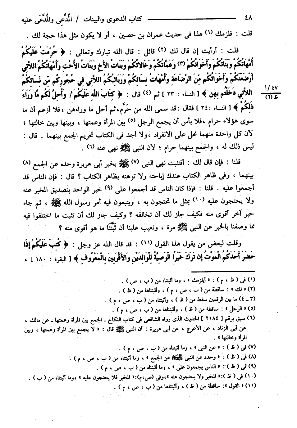 قُلْت: فَلَزِمَك هَذَا فِي حَدِيثِ عِمْرَانَ بْنِ حُصَيْنٍ , أَوْ لاَ يَكُونُ مِثْلُ هَذَا حُجَّةً لَك قُلْت: أَرَأَيْت إنْ قَالَ قَائِلٌ. قَالَ اللَّهُ تَبَارَكَ وَتَعَالَى: ? حُرِّمَتْ عَلَيْكُمْ أُمَّهَاتُكُمْ وَبَنَاتُكُمْ وَأَخَوَاتُكُمْ وَعَمَّاتُكُمْ وَخَالاَتُكُمْ وَبَنَاتُ الْأَخِ وَبَنَاتُ الْأُخْتِ وَأُمَّهَاتُكُمْ اللَّاتِي أَرْضَعْنَكُمْ وَأَخَوَاتُكُمْ مِنْ الرَّضَاعَةِ وَأُمَّهَاتُ نِسَائِكُمْ وَرَبَائِبُكُمْ اللَّاتِي فِي حُجُورِكُمْ مِنْ نِسَائِكُمْ اللَّاتِي دَخَلْتُمْ بِهِنَّ ? , ثُمَّ قَالَ: ? كِتَابَ اللَّهِ عَلَيْكُمْ وَأُحِلَّ لَكُمْ مَا وَرَاءَ ذَلِكُمْ ? فَقَالَ قَدْ سَمَّى اللَّهُ مَنْ حَرَّمَ , ثُمَّ أَحَلَّ مَا وَرَاءَهُنَّ فَلاَ أَزْعُمُ أَنَّ مَا سِوَى هَؤُلاَءِ حَرَامٌ فَلاَ بَأْسَ أَنْ يَجْمَعَ الرَّجُلُ بَيْنَ الْمَرْأَةِ وَعَمَّتِهَا وَبَيْنَهَا وَبَيْنَ خَالَتِهَا ; لِأَنَّ كُلَّ وَاحِدَةٍ مِنْهُمَا تَحِلُّ عَلَى الِانْفِرَادِ وَلاَ أَجِدُ فِي الْكِتَابِ تَحْرِيمَ الْجَمْعِ بَيْنَهُمَا قَالَ لَيْسَ ذَلِكَ لَهُ , وَالْجَمْعُ بَيْنَهُمَا حَرَامٌ ; لِأَنَّ النَّبِيَّ - صلى الله عليه وسلم - نَهَى عَنْهُ قُلْنَا فَإِنْ قَالَ لَك أَفَتُثْبِتُ نَهْيَ النَّبِيِّ - صلى الله عليه وسلم - بِخَبَرِ أَبِي هُرَيْرَةَ رضي الله تعالى عنه وَحْدَهُ عَنْ الْجَمْعِ بَيْنَهُمَا وَفِي ظَاهِرِ الْكِتَابِ عِنْدَك إبَاحَتُهُ وَلاَ تُوهِنُهُ بِظَاهِرِ الْكِتَابِ قَالَ فَإِنَّ النَّاسَ قَدْ أَجْمَعُوا عَلَيْهِ قُلْنَا فَإِذَا كَانَ النَّاسُ أَجْمَعُوا عَلَى خَبَرِ الْوَاحِدِ بِتَصْدِيقِ الْمُخْبَرِ عَنْهُ وَلاَ يَحْتَجُّونَ عَلَيْهِ بِمِثْلِ مَا تَحْتَجُّونَ بِهِ وَيَتَّبِعُونَ فِيهِ أَمْرَ رَسُولِ اللَّهِ - صلى الله عليه وسلم - ثُمَّ جَاءَ خَبَرٌ آخَرُ أَقْوَى مِنْهُ فَكَيْفَ جَازَ لَك أَنْ تُخَالِفَهُ وَكَيْفَ جَازَ لَك أَنْ تُثْبِتَ مَا اخْتَلَفُوا فِيهِ مِمَّا وَصَفْنَا بِالْخَبَرِ عَنْ النَّبِيِّ - صلى الله عليه وسلم - مَرَّةً وَتَعِيبُ عَلَيْنَا أَنْ ثَبَتْنَا مَا هُوَ أَقْوَى مِنْهُ وَقُلْت لِبَعْضِ مَنْ يَقُولُ هَذَا الْقَوْلَ قَدْ قَالَ اللَّهُ عَزَّ وَجَلَّ: ? كُتِبَ عَلَيْكُمْ إذَا حَضَرَ أَحَدَكُمْ الْمَوْتُ إنْ تَرَكَ خَيْرًا الْوَصِيَّةُ لِلْوَالِدَيْنِ , وَالْأَقْرَبِينَ بِالْمَعْرُوفِ ?@