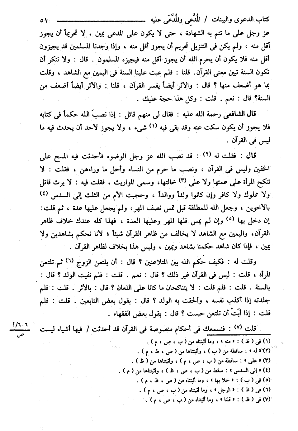 قَالَ الشَّافِعِيُّ : : رحمه الله تعالى فَقَالَ لِي مِنْهُمْ قَائِلٌ إذَا نَصَبَ اللَّهُ حُكْمًا فِي كِتَابِهِ فَلاَ يَجُوزُ أَنْ يَكُونَ سَكَتَ عَنْهُ , وَقَدْ بَقِيَ فِيهِ شَيْءٌ وَلاَ يَجُوزُ لِأَحَدٍ أَنْ يُحَدِّثَ فِيهِ مَا لَيْسَ فِي الْقُرْآنِ قَالَ فَقُلْت قَدْ نَصَبَ اللَّهُ عَزَّ وَجَلَّ الْوُضُوءَ , فَأَحْدَثْت فِيهِ الْمَسْحَ عَلَى الْخُفَّيْنِ وَلَيْسَ فِي الْقُرْآنِ وَنَصَبَ مَا حُرِّمَ مِنْ النِّسَاءِ وَأُحِلَّ مَا وَرَاءَهُنَّ فَقُلْت لاَ تُنْكَحُ الْمَرْأَةُ عَلَى عَمَّتِهَا وَلاَ خَالَتِهَا وَسَمَّى الْمَوَارِيثَ فَقُلْت فِيهِ لاَ يَرِثُ قَاتِلٌ وَلاَ مَمْلُوكٌ وَلاَ كَافِرٌ وَإِنْ كَانُوا وَلَدًا وَوَالِدًا وَحَجَبْت الْأُمَّ مِنْ الثُّلُثِ بِالْأَخَوَيْنِ وَجَعَلَ اللَّهُ لِلْمُطَلَّقَةِ قَبْلَ أَنْ تُمَسَّ نِصْفَ الْمَهْرِ وَلَمْ يَجْعَلْ عَلَيْهَا عِدَّةً , ثُمَّ قُلْت إنْ خَلاَ بِهَا وَإِنْ لَمْ يَمَسَّ فَلَهَا الْمَهْرُ وَعَلَيْهَا الْعِدَّةُ فَهَذَا كُلُّهُ عِنْدَك خِلاَفُ ظَاهِرِ الْقُرْآنِ , وَالْيَمِينُ مَعَ الشَّاهِدِ لاَ يُخَالِفُ مِنْ ظَاهِرِ الْقُرْآنِ شَيْئًا ; لِأَنَّا نَحْكُمُ بِشَاهِدَيْنِ وَلاَ يَمِينَ فَإِذَا كَانَ شَاهِدٌ حَكَمْنَا بِشَاهِدٍ وَيَمِينٍ وَلَيْسَ هَذَا بِخِلاَفٍ لِظَاهِرِ الْقُرْآنِ وَقُلْت لَهُ فَكَيْفَ حَكَمَ اللَّهُ تَعَالَى بَيْنَ الْمُتَلاَعِنَيْنِ قَالَ أَنْ يَلْتَعِنَ الزَّوْجُ , ثُمَّ تَلْتَعِنَ الْمَرْأَةُ قُلْت لَيْسَ فِي الْقُرْآنِ غَيْرُ ذَلِكَ قَالَ نَعَمْ قُلْت فَلِمَ نَفَيْت الْوَلَدَ قَالَ بِالسُّنَّةِ قُلْت فَلِمَ قُلْت لاَ يَتَنَاكَحَانِ مَا كَانَا عَلَى اللِّعَانِ قَالَ بِالْأَثَرِ قُلْت فَلِمَ جَلَدْته إذَا أَكْذَبَ نَفْسَهُ وَأَلْحَقْت بِهِ الْوَلَدَ قَالَ بِقَوْلِ بَعْضِ التَّابِعِينَ قُلْت فَلِمَ قُلْت إذَا أَبَتْ أَنْ تَلْتَعِنَ حُبِسَتْ قَالَ بِقَوْلِ بَعْضِ الْفُقَهَاءِ قُلْت فَنَسْمَعُك فِي أَحْكَامٍ مَنْصُوصَةٍ فِي الْقُرْآنِ قَدْ أَحْدَثْت فِيهَا أَشْيَاءَ لَيْسَتْ@