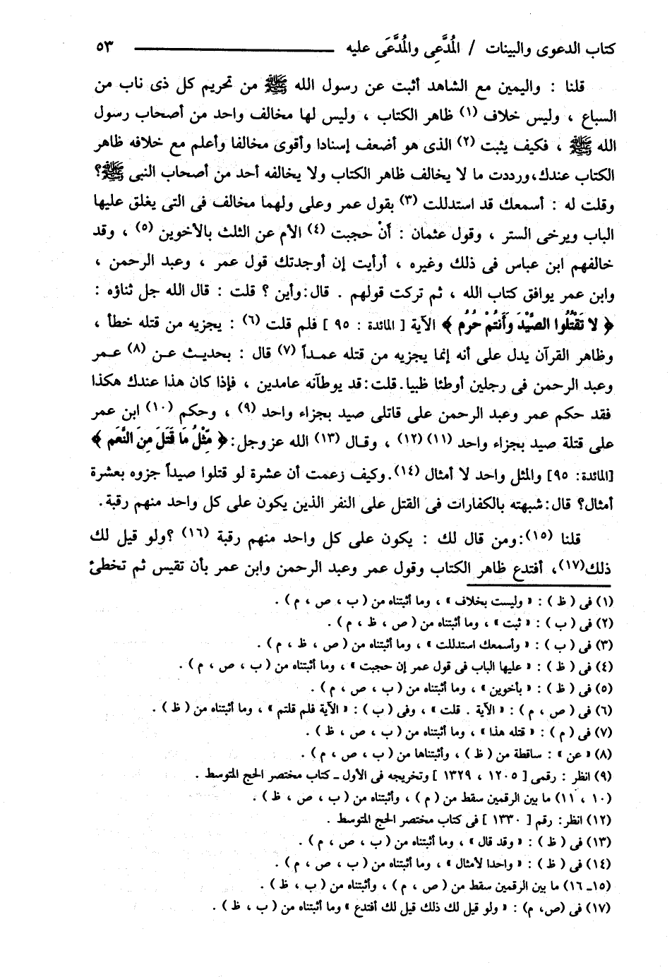 -. قُلْنَا , وَالْيَمِينُ مَعَ الشَّاهِدِ أَثْبَتُ عَنْ رَسُولِ اللَّهِ - صلى الله عليه وسلم - مِنْ تَحْرِيمِ كُلِّ ذِي نَابٍ مِنْ السِّبَاعِ وَلَيْسَ خِلاَفَ ظَاهِرِ الْكِتَابِ وَلَيْسَ لَهَا مُخَالِفٌ وَاحِدٌ مِنْ أَصْحَابِ رَسُولِ اللَّهِ - صلى الله عليه وسلم - فَكَيْفَ ثَبَتَ الَّذِي هُوَ أَضْعَفُ إسْنَادًا وَأَقْوَى مُخَالَفًا وَأَعْلَمُ مَعَ خِلاَفِهِ ظَاهِرَ الْكِتَابِ عِنْدَك وَرَدَدْت مَا لاَ يُخَالِفُ ظَاهِرَ الْكِتَابِ وَلاَ يُخَالِفُهُ أَحَدٌ مِنْ أَصْحَابِ النَّبِيِّ - صلى الله عليه وسلم - وَقُلْت لَهُ أَسْمَعُك اسْتَدْلَلْت بِقَوْلِ عُمَرَ وَعَلِيٍّ رضي الله تعالى عنهما وَلَهُمَا مُخَالِفٌ فِي الَّتِي يُغْلَقُ عَلَيْهَا الْبَابُ وَيُرْخَى السِّتْرُ وَقَوْلُ عُثْمَانَ أَنْ حَجَبَتْ الْأُمَّ عَنْ الثُّلُثِ بِالْأَخَوَيْنِ , وَقَدْ خَالَفَهُمْ ابْنُ عَبَّاسٍ فِي ذَلِكَ وَغَيْرِهِ أَرَأَيْت إنْ , أَوْجَدْتُك قَوْلَ عُمَرَ وَعَبْدِ الرَّحْمَنِ وَابْنِ عُمَرَ يُوَافِقُ كِتَابَ اللَّهِ , ثُمَّ تَرَكْت قَوْلَهُمْ قَالَ وَأَيْنَ؟ قُلْت قَالَ اللَّهُ عَزَّ وَجَلَّ: ? لاَ تَقْتُلُوا الصَّيْدَ وَأَنْتُمْ حُرُمٌ ? الآيَةَ. فَلِمَ قُلْتُمْ يَجْزِيه مَنْ قَتَلَهُ خَطَأً وَظَاهِرُ الْقُرْآنِ يَدُلُّ عَلَى أَنَّهُ إنَّمَا يَجْزِيه مَنْ قَتَلَهُ عَمْدًا قَالَ بِحَدِيثٍ عَنْ عُمَرَ وَعَبْدِ الرَّحْمَنِ فِي رَجُلَيْنِ , أَوْطَئَا ظَبْيًا قُلْت قَدْ يُوطِئَانِهِ عَامِدَيْنِ فَإِذَا كَانَ هَذَا عَنْك هَكَذَا فَقَدْ حَكَمَ عُمَرُ وَعَبْدُ الرَّحْمَنِ عَلَى قَاتِلَيْ صَيْدٍ بِجَزَاءِ وَاحِدٍ وَحَكَمَ ابْنُ عُمَرَ عَلَى قَتَلَةِ صَيْدٍ بِجَزَاءِ وَاحِدٍ وَقَالَ اللَّهُ عَزَّ وَجَلَّ: ? مِثْلُ مَا قَتَلَ مِنْ النَّعَمِ ? , وَالْمِثْلُ وَاحِدٌ لاَ أَمْثَالٌ وَكَيْفَ زَعَمْت أَنَّ عَشْرَةً لَوْ قَتَلُوا صَيْدًا جَزَوْهُ بِعَشْرَةِ أَمْثَالٍ قَالَ شَبَّهْته بِالْكَفَّارَاتِ فِي الْقَتْلِ عَلَى النَّفَرِ الَّذِينَ يَكُونُ عَلَى كُلِّ وَاحِدٍ مِنْهُمْ رَقَبَةٌ قُلْنَا وَمَنْ قَالَ لَك يَكُونُ عَلَى كُلِّ وَاحِدٍ مِنْهُمْ رَقَبَةٌ , وَلَوْ قِيلَ: لَك ذَلِكَ أَفَتَدَعُ ظَاهِرَ الْكِتَابِ وَقَوْلَ عُمَرَ وَعَبْدِ الرَّحْمَنِ وَابْنِ عُمَرَ بِأَنْ تَقِيسَ , ثُمَّ تُخَطِّئَ@