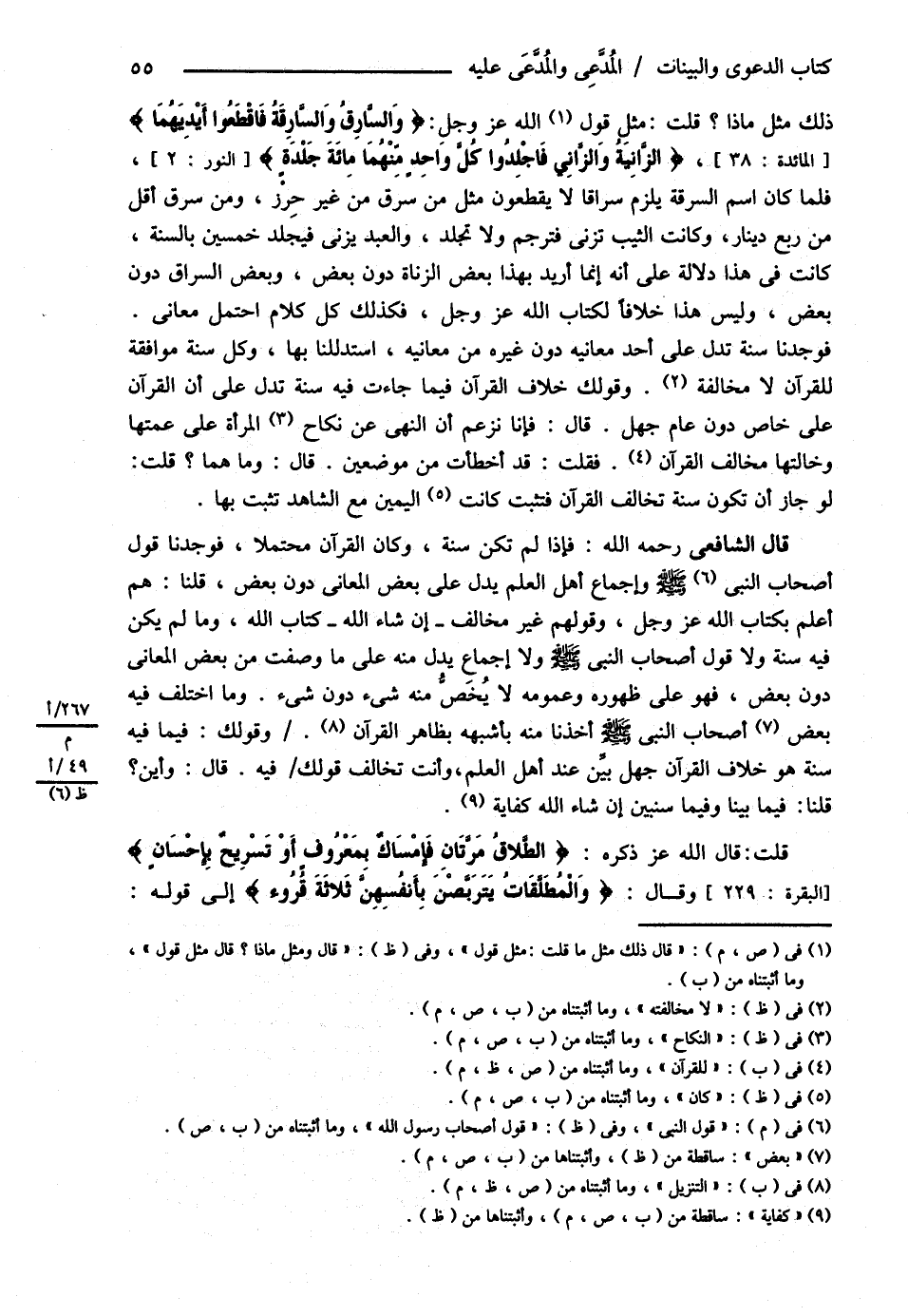 ذَلِكَ مِثْلُ مَاذَا قُلْت مِثْلُ قَوْلِ اللَّهِ عَزَّ وَجَلَّ: ? وَالسَّارِقُ وَالسَّارِقَةُ فَاقْطَعُوا أَيْدِيَهُمَا ?: ? الزَّانِيَةُ وَالزَّانِي فَاجْلِدُوا كُلَّ وَاحِدٍ مِنْهُمَا مِائَةَ جَلْدَةٍ ? فَلَمَّا كَانَ اسْمُ السَّرِقَةِ يَلْزَمُ سُرَّاقًا لاَ يُقْطَعُونَ مِثْلَ مَنْ سَرَقَ مِنْ غَيْرِ حِرْزٍ وَمَنْ سَرَقَ أَقَلَّ مِنْ رُبْعِ دِينَارٍ. وَكَانَتْ الثَّيِّبُ تَزْنِي فَتُرْجَمُ وَلاَ تُجْلَدُ , وَالْعَبْدُ يَزْنِي فَيُجْلَدُ خَمْسِينَ بِالسُّنَّةِ كَانَتْ فِي هَذَا دَلاَلَةٌ عَلَى أَنَّهُ إنَّمَا أُرِيدَ بِهَذَا بَعْضُ الزُّنَاةِ دُونَ بَعْضٍ وَبَعْضُ السُّرَّاقِ دُونَ بَعْضٍ وَلَيْسَ هَذَا خِلاَفًا لِكِتَابِ اللَّهِ عَزَّ وَجَلَّ فَكَذَلِكَ كُلُّ كَلاَمٍ احْتَمَلَ مَعَانِي فَوَجَدْنَا سُنَّةً تَدُلُّ عَلَى أَحَدِ مَعَانِيه دُونَ غَيْرِهِ مِنْ مَعَانِيه اسْتَدْلَلْنَا بِهَا وَكُلُّ سُنَّةٍ مُوَافِقَةٌ لِلْقُرْآنِ لاَ مُخَالِفَةٌ وَقَوْلُك خِلاَفُ الْقُرْآنِ فِيمَا جَاءَتْ فِيهِ سُنَّةٌ تَدُلُّ عَلَى أَنَّ الْقُرْآنَ عَلَى خَاصٍّ دُونَ عَامٍّ جَهْلٌ , قَالَ فَإِنَّا نَزْعُمُ أَنَّ النَّهْيَ عَنْ نِكَاحِ الْمَرْأَةِ عَلَى عَمَّتِهَا وَخَالَتِهَا مُخَالِفٌ لِلْقُرْآنِ. فَقُلْت قَدْ أَخْطَأْت مِنْ مَوْضِعَيْنِ قَالَ وَمَا هُمَا؟ قُلْت: لَوْ جَازَ أَنْ تَكُونَ سُنَّةٌ تُخَالِفُ الْقُرْآنَ فَتَثْبُت كَانَتْ الْيَمِينُ مَعَ الشَّاهِدِ تَثْبُت بِهَا