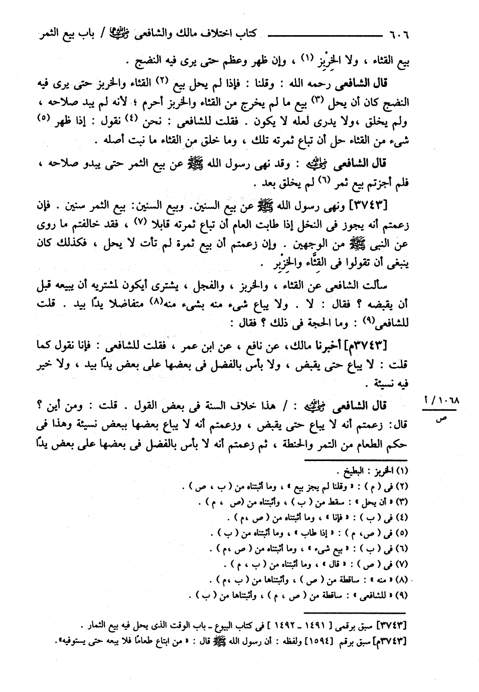 قَالَ الشَّافِعِيُّ : : وَقَدْ : ? نَهَى رَسُولُ اللَّهِ - صلى الله عليه وسلم - عَنْ بَيْعِ الثَّمَرِ حَتَّى يَبْدُوَ صَلاَحُهُ ? فَلِمَ أَجَزْتُمْ بَيْعَ شَيْءٍ لَمْ يُخْلَقْ بَعْدُ ؟ : ? وَنَهَى رَسُولُ اللَّهِ - صلى الله عليه وسلم - عَنْ بَيْعِ السِّنِينَ ? وَبَيْعُ السِّنِينَ بَيْعُ الثَّمَرِ سِنِينَ فَإِنْ زَعَمْتُمْ أَنَّهُ يَجُوزُ فِي النَّخْلِ إذَا طَابَتْ الْعَامَ أَنَّ ثَمَرَتَهُ قَابِلاً فَقَدْ خَالَفْتُمْ مَا رُوِيَ عَنْ النَّبِيِّ - صلى الله عليه وسلم - مِنْ الْوَجْهَيْنِ وَإِنْ زَعَمْتُمْ أَنَّ بَيْعَ ثَمَرَةٍ لَمْ تَأْتِ لاَ يَحِلُّ فَكَذَلِكَ كَانَ يَنْبَغِي أَنْ تَقُولُوا فِي الْقِثَّاءِ وَالْخِرْبِزِ سَأَلْت الشَّافِعِيَّ عَنْ الْقِثَّاءِ وَالْخِرْبِزِ وَالْفُجْلِ يُشْتَرَى أَيَكُونُ لِمُشْتَرِيهِ أَنْ يَبِيعَهُ قَبْلَ أَنْ يَقْبِضَهُ فَقَالَ : لاَ وَلاَ يُبَاعُ شَيْءٌ مِنْهُ بِشَيْءٍ مِنْهُ مُتَفَاضِلاً يَدًا بِيَدٍ قُلْت لِلشَّافِعِيِّ : وَمَا الْحُجَّةُ فِي ذَلِكَ ؟ فَقَالَ : أَخْبَرَنَا مَالِكٌ عَنْ نَافِعٍ عَنْ ابْنِ عُمَرَ فَقُلْت لِلشَّافِعِيِّ : فَإِنَّا نَقُولُ كَمَا قُلْت : لاَ يُبَاعُ حَتَّى يُقْبَضَ وَلاَ بَأْسَ بِالْفَضْلِ فِي بَعْضِهَا عَلَى بَعْضٍ يَدًا بِيَدٍ وَلاَ خَيْرَ فِيهِ نَسِيئَةً