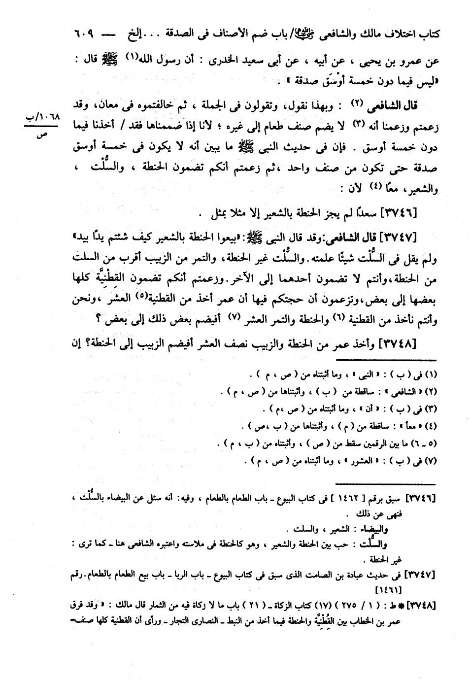 قَالَ : وَبِهَذَا نَقُولُ وَتَقُولُونَ فِي الْجُمْلَةِ ثُمَّ خَالَفْتُمُوهُ فِي مَعَانٍ وَقَدْ زَعَمْتُمْ وَزَعَمْنَا أَنْ لاَ يُضَمَّ صِنْفُ طَعَامٍ إلَى غَيْرِهِ لِأَنَّا إذَا ضَمَمْنَاهَا فَقَدْ أَخَذْنَا فِيمَا دُونَ خَمْسَةِ أَوْسُقٍ فَإِنَّ فِي حَدِيثِ النَّبِيِّ - صلى الله عليه وسلم - مَا يُبَيِّنُ أَنَّهُ لاَ يَكُونُ فِي خَمْسَةِ أَوْسُقٍ صَدَقَةٌ حَتَّى تَكُونَ مِنْ صِنْفٍ وَاحِدٍ ثُمَّ زَعَمْتُمْ أَنَّكُمْ تَضُمُّونَ الْحِنْطَةَ وَالسُّلْتَ وَالشَّعِيرَ مَعًا لِأَنَّ