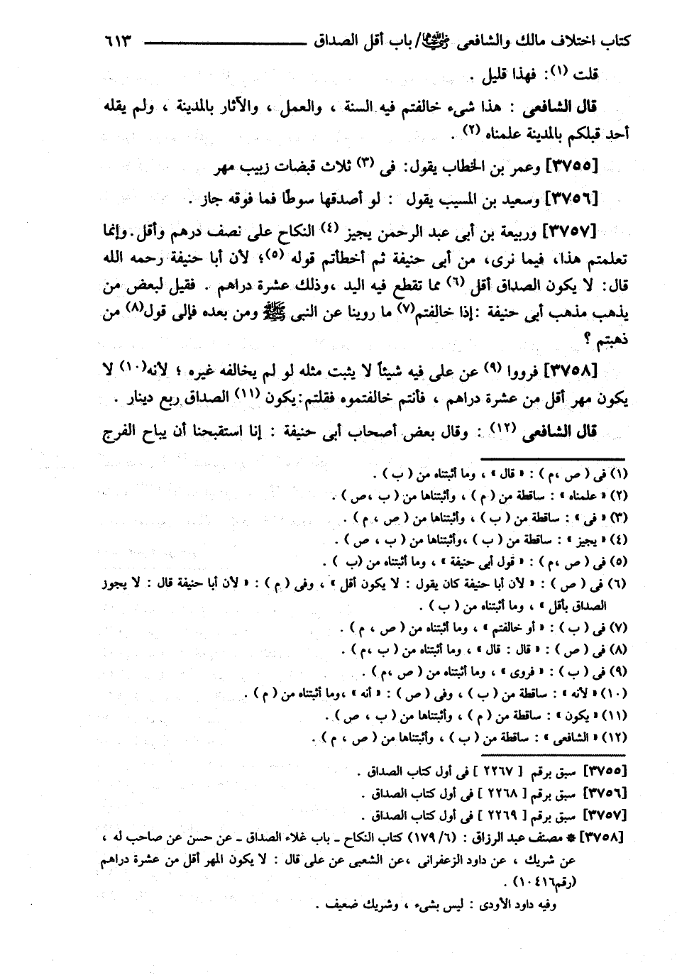 قَالَ الشَّافِعِيُّ : : هَذَا شَيْءٌ خَالَفْتُمْ بِهِ السُّنَّةَ وَالْعَمَلَ وَالْآثَارَ بِالْمَدِينَةِ , وَلَمْ يَقُلْهُ أَحَدٌ قَبْلَكُمْ بِالْمَدِينَةِ عَلِمْنَاهُ وَعُمَرُ بْنُ الْخَطَّابِ يَقُولُ : ثَلاَثُ قَبَضَاتِ زَبِيبٍ مَهْرٌ وَسَعِيدُ بْنُ الْمُسَيِّبِ يَقُولُ : لَوْ أَصْدَقَهَا سَوْطًا فَمَا فَوْقَهُ جَازَ وَرَبِيعَةُ بْنُ أَبِي عَبْدِ الرَّحْمَنِ يُجِيزُ النِّكَاحَ عَلَى نِصْفِ دِرْهَمٍ وَأَقَلَّ وَإِنَّمَا تَعَلَّمْتُمْ هَذَا فِيمَا نَرَى مِنْ أَبِي حَنِيفَةَ ثُمَّ أَخْطَأْتُمْ قَوْلُهُ لِأَنَّ أَبَا حَنِيفَةَ قَالَ : لاَ يَكُونُ الصَّدَاقُ أَقَلَّ مِمَّا نَقْطَعُ فِيهِ الْيَدَ , وَذَلِكَ عَشَرَةُ دَرَاهِمَ فَقِيلَ لِبَعْضِ مَنْ يَذْهَبُ مَذْهَبَ أَبِي حَنِيفَةَ : أَوْ خَالَفْتُمْ مَا رَوَيْنَا عَنْ النَّبِيِّ - صلى الله عليه وسلم - وَمَنْ بَعْدَهُ فَإِلَى قَوْلِ مَنْ ذَهَبْتُمْ ؟ فَرَوَى عَنْ عَلِيٍّ فِيهِ شَيْئًا لاَ يَثْبُتُ مِثْلُهُ لَوْ لَمْ يُخَالِفْهُ غَيْرُهُ لاَ يَكُونُ مَهْرٌ أَقَلَّ مِنْ عَشَرَةِ دَرَاهِمَ فَأَنْتُمْ خَالَفْتُمُوهُ فَقُلْتُمْ : يَكُونُ الصَّدَاقُ رُبْعَ دِينَارٍ قَالَ : وَقَالَ بَعْضُ أَصْحَابِ أَبِي حَنِيفَةَ : إنَّا اسْتَقْبَحْنَا أَنْ يُبَاحَ الْفَرْجُ @