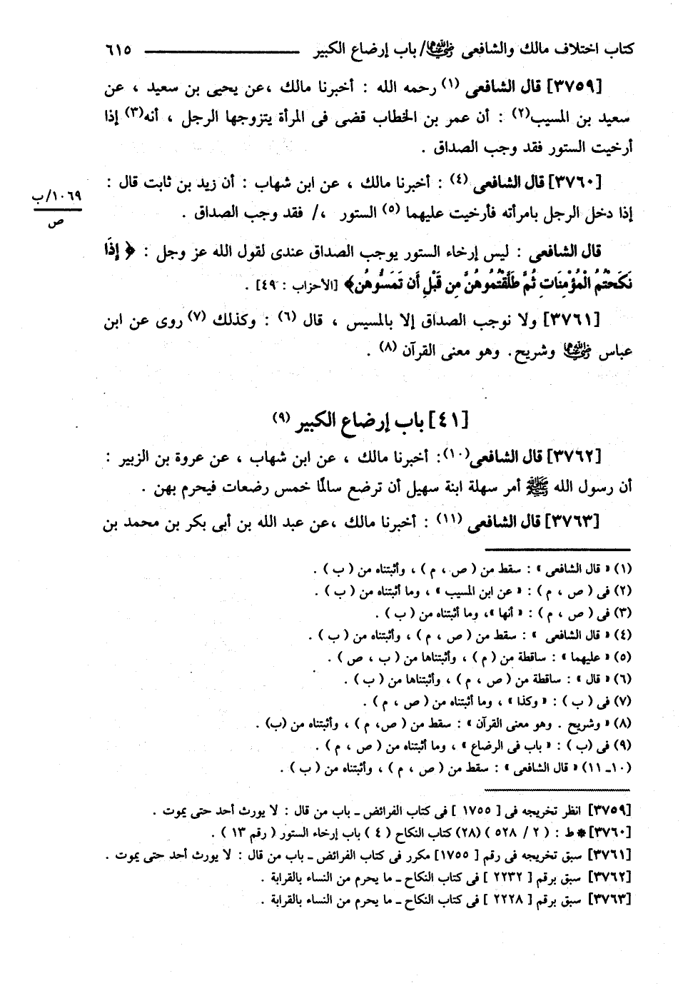 قَالَ الشَّافِعِيُّ : : أَخْبَرَنَا مَالِكٌ عَنْ ابْنِ شِهَابٍ عَنْ عُرْوَةَ بْنِ الزُّبَيْرِ : ? أَنَّ رَسُولَ اللَّهِ - صلى الله عليه وسلم - أَمَرَ سَهْلَةَ ابْنَة سُهَيْلٍ أَنْ تُرْضِعَ سَالِمًا خَمْسَ رَضَعَاتٍ فَيَحْرُمُ بِهِنَّ ?