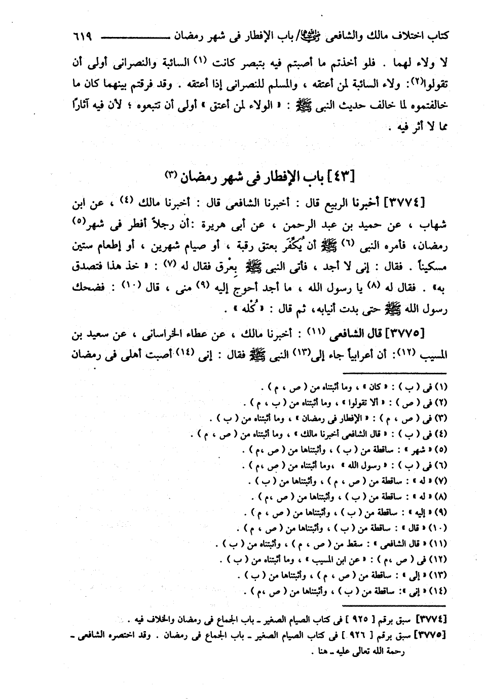 قَالَ الشَّافِعِيُّ : : أَخْبَرَنَا مَالِكٌ عَنْ عَطَاءٍ الْخُرَاسَانِيِّ عَنْ سَعِيدِ بْنِ الْمُسَيِّبِ : ? أَنَّ أَعْرَابِيًّا جَاءَ إلَى النَّبِيِّ - صلى الله عليه وسلم - فَقَالَ : أَصَبْت أَهْلِي فِي رَمَضَانَ@