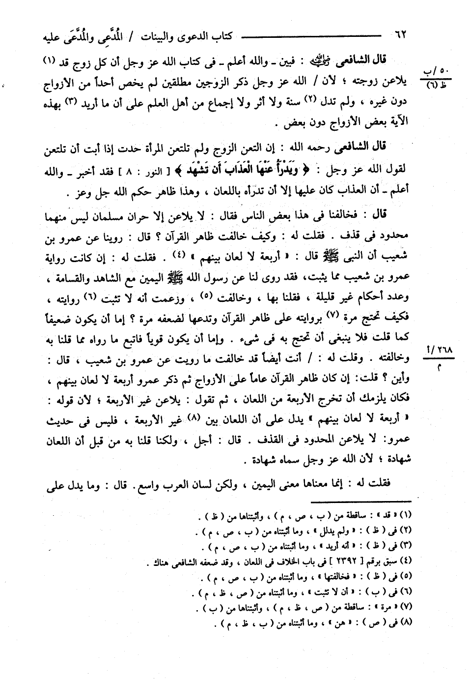 قَالَ الشَّافِعِيُّ: رحمه الله تعالى: فَبَيَّنَ - وَاَللَّهُ أَعْلَمُ - فِي كِتَابِ اللَّهِ عَزَّ وَجَلَّ أَنَّ كُلَّ زَوْجٍ يُلاَعِنُ زَوْجَتَهُ ; لِأَنَّ اللَّهَ عَزَّ وَجَلَّ ذَكَرَ الزَّوْجَيْنِ مُطْلَقَيْنِ لَمْ يَخُصَّ أَحَدًا مِنْ الْأَزْوَاجِ دُونَ غَيْرِهِ وَلَمْ تَدُلَّ سُنَّةٌ وَلاَ أَثَرٌ وَلاَ إجْمَاعٌ مِنْ أَهْلِ الْعِلْمِ عَلَى أَنَّ مَا أُرِيدَ بِهَذِهِ الآيَةِ بَعْضُ الْأَزْوَاجِ دُونَ بَعْضٍ
