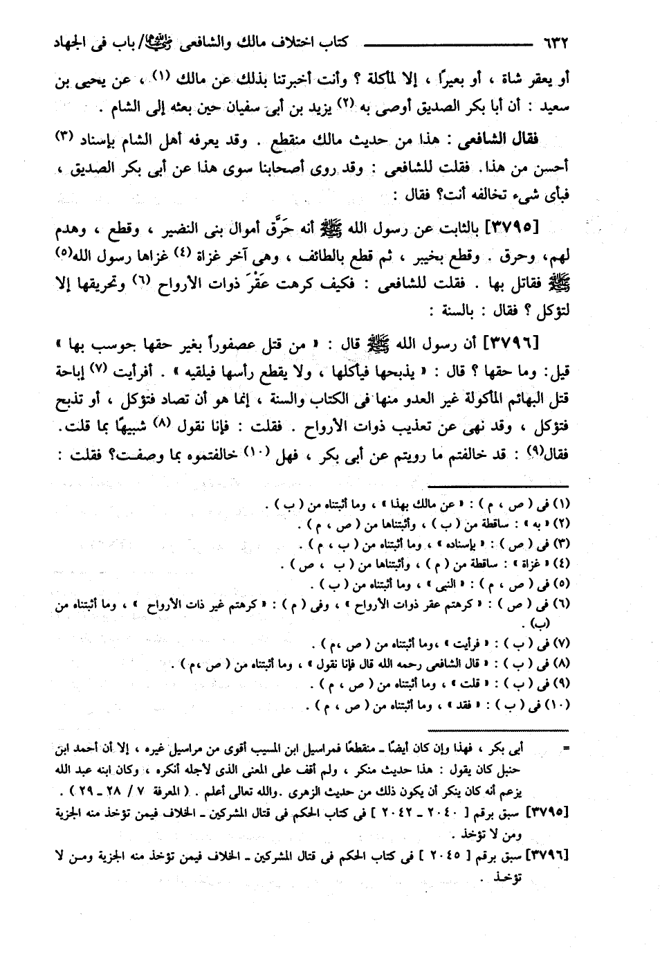 أَوْ يَعْقِرَ شَاةً أَوْ بَعِيرًا إلَّا لِمَأْكَلَةٍ وَأَنْتَ أَخْبَرْتَنَا بِذَلِكَ عَنْ مَالِكٍ عَنْ يَحْيَى بْنِ سَعِيدٍ أَنَّ أَبَا بَكْرٍ الصِّدِّيقَ أَوْصَى يَزِيدَ بْنَ أَبِي سُفْيَانَ حِينَ بَعَثَهُ إلَى الشَّامِ فَقَالَ الشَّافِعِيُّ : هَذَا مِنْ حَدِيثِ مَالِكٍ مُنْقَطِعٌ وَقَدْ يَعْرِفُهُ أَهْلُ الشَّامِ بِإِسْنَادٍ أَحْسَنَ مِنْ هَذَا فَقُلْت لِلشَّافِعِيِّ : وَقَدْ رَوَى أَصْحَابُنَا سِوَى هَذَا عَنْ أَبِي بَكْرٍ فَبِأَيِّ شَيْءٍ تُخَالِفُهُ أَنْتَ ؟ فَقَالَ : بِالثَّابِتِ عَنْ رَسُولِ اللَّهِ - صلى الله عليه وسلم - أَنَّهُ حَرَقَ أَمْوَالَ بَنِي النَّضِيرِ وَقَطَعَ وَهَدَمَ لَهُمْ وَحَرَقَ وَقَطَعَ بِخَيْبَرَ ثُمَّ قَطَعَ بِالطَّائِفِ وَهِيَ آخِرُ غَزَاةٍ غَزَاهَا رَسُولُ اللَّهِ - صلى الله عليه وسلم - فَقَاتَلَ بِهَا , فَقُلْت لِلشَّافِعِيِّ : فَكَيْفَ كَرِهْت عَقْرَ ذَوَاتِ الْأَرْوَاحِ وَتَحْرِيقَهَا إلَّا لِتُؤْكَلَ ؟ فَقَالَ : بِالسُّنَّةِ أَنَّ رَسُولَ اللَّهِ - صلى الله عليه وسلم - قَالَ : : ? مَنْ قَتَلَ عُصْفُورًا بِغَيْرِ حَقِّهَا حُوسِبَ بِهَا قِيلَ : وَمَا حَقُّهَا قَالَ : يَذْبَحُهَا فَيَأْكُلُهَا وَلاَ يَقْطَعُ رَأْسَهَا فَيُلْقِيهِ ? فَرَأَيْت إبَاحَةَ قَتْلِ الْبَهَائِمِ الْمَأْكُولَةِ غَيْرِ الْعَدُوِّ مِنْهَا فِي الْكِتَابِ وَالسُّنَّةِ إنَّمَا هُوَ أَنْ تُصَادَ فَتُؤْكَلَ أَوْ تُذْبَحَ فَتُؤْكَلَ وَقَدْ نَهَى عَنْ تَعْذِيبِ ذَوَاتِ الْأَرْوَاحِ
