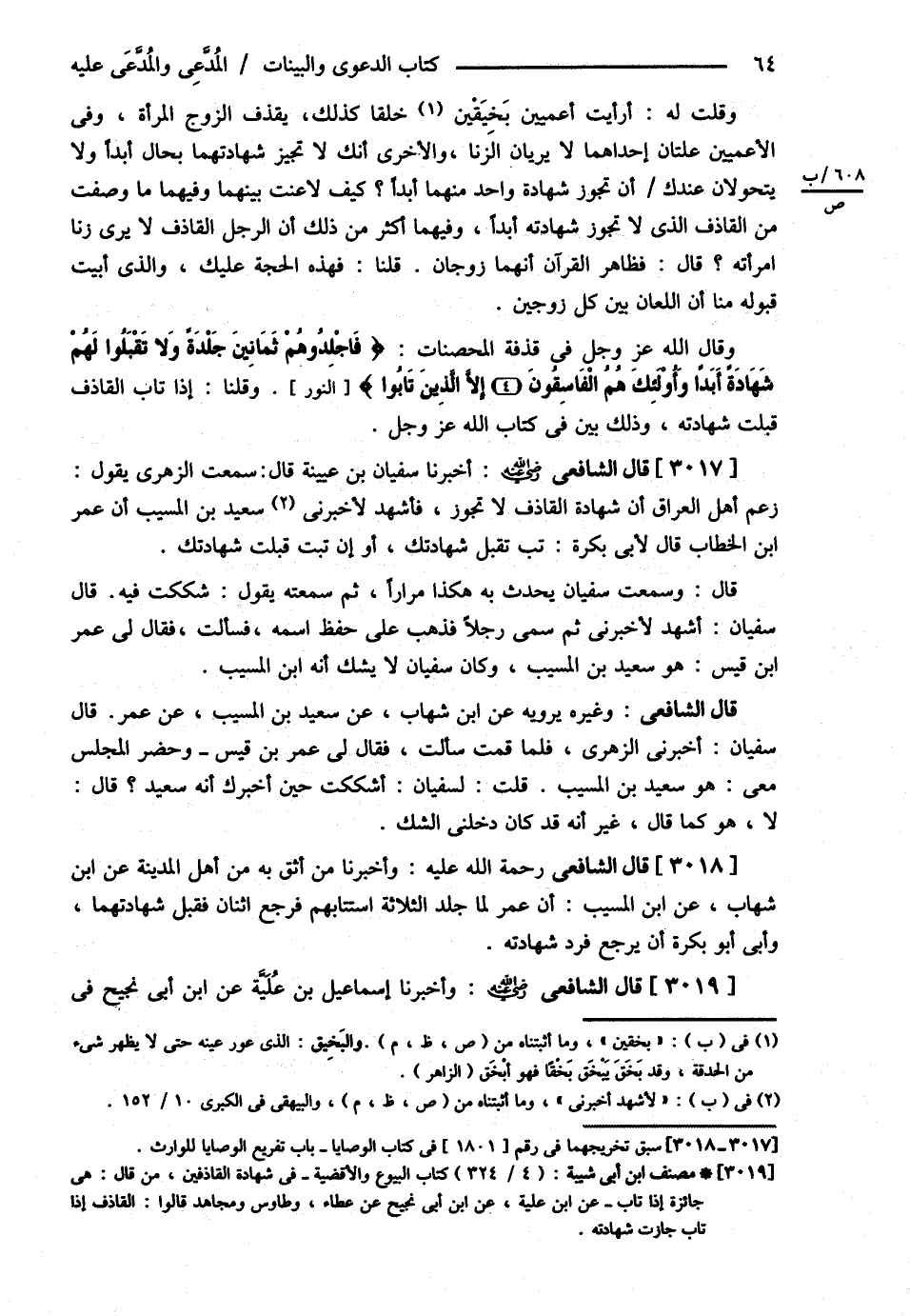قَالَ الشَّافِعِيُّ: رحمه الله تعالى: أَخْبَرَنَا سُفْيَانُ بْنُ عُيَيْنَةَ قَالَ سَمِعْت الزُّهْرِيَّ يَقُولُ زَعَمَ أَهْلُ الْعِرَاقِ أَنَّ شَهَادَةَ الْقَاذِفِ لاَ تَجُوزُ. لاََشْهَدُ أَخْبَرَنِي سَعِيدُ بْنُ الْمُسَيِّبِ أَنَّ عُمَرَ بْنَ الْخَطَّابِ قَالَ لِأَبِي بَكْرَةَ تُبْ تُقْبَلْ شَهَادَتُك , أَوْ إنْ تُبْت قُبِلَتْ شَهَادَتُك قَالَ وَسَمِعْت سُفْيَانَ يُحَدِّثُ بِهِ هَكَذَا مِرَارًا , ثُمَّ سَمِعْته يَقُولُ شَكَكْت فِيهِ قَالَ سُفْيَانُ أَشْهَدُ لاََخْبَرَنِي , ثُمَّ سَمَّى رَجُلاً فَذَهَبَ عَلَى حِفْظِ اسْمِهِ فَسَأَلْت فَقَالَ لِي عُمَرُ بْنُ قَيْسٍ هُوَ سَعِيدُ بْنُ الْمُسَيِّبِ , وَكَانَ سُفْيَانُ لاَ يَشُكُّ أَنَّهُ ابْنُ الْمُسَيِّبِ