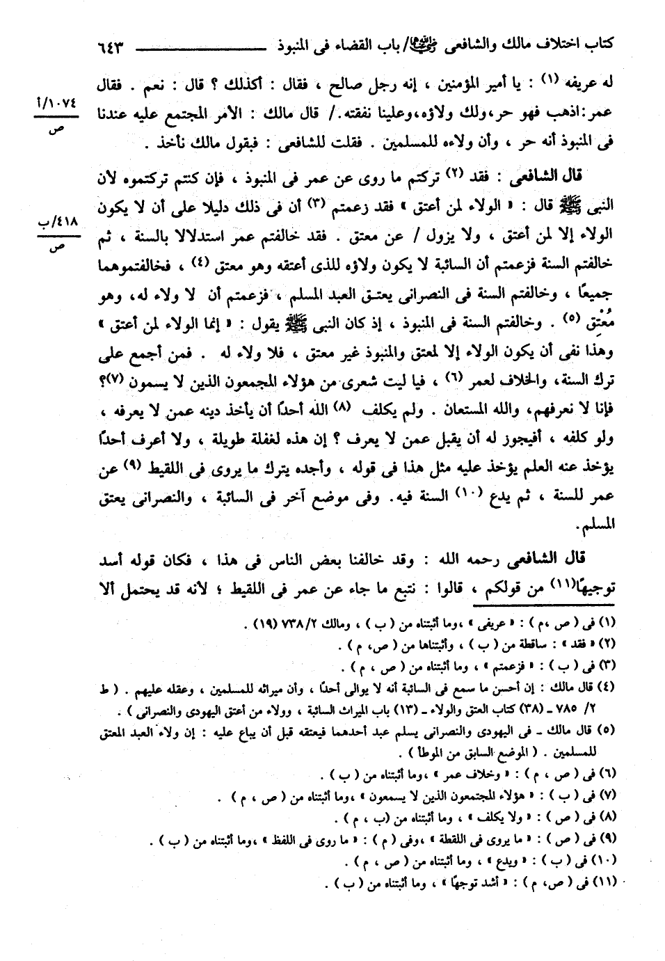 قَالَ الشَّافِعِيُّ : : تَرَكْتُمْ مَا رُوِيَ عَنْ عُمَرَ فِي الْمَنْبُوذِ فَإِنْ كُنْتُمْ تَرَكْتُمُوهُ لِأَنَّ النَّبِيَّ - صلى الله عليه وسلم - قَالَ : : ? الْوَلاَءُ لِمَنْ أَعْتَقَ ? فَزَعَمْتُمْ أَنَّ فِي ذَلِكَ دَلِيلاً عَلَى أَنْ لاَ يَكُونَ الْوَلاَءُ إلَّا لِمَنْ أَعْتَقَ وَلاَ يَزُولُ عَنْ مُعْتَقٍ فَقَدْ خَالَفْتُمْ عُمَرَ اسْتِدْلاَلاً بِالسُّنَّةِ ثُمَّ خَالَفْتُمْ السُّنَّةَ فَزَعَمْتُمْ أَنَّ السَّائِبَةَ لاَ يَكُونُ وَلاَؤُهُ لِلَّذِي أَعْتَقَهُ وَهُوَ مُعْتَقٌ فَخَالَفْتُمُوهُمَا جَمِيعًا وَخَالَفْتُمْ السُّنَّةَ فِي النَّصْرَانِيِّ يُعْتِقُ الْعَبْدَ الْمُسْلِمَ فَزَعَمْتُمْ أَنْ لاَ وَلاَءَ لَهُ وَهُوَ مُعْتِقٌ وَخَالَفْتُمْ السُّنَّةَ فِي الْمَنْبُوذِ إذْ كَانَ النَّبِيُّ - صلى الله عليه وسلم - يَقُولُ : ? : إنَّمَا الْوَلاَءُ لِمَنْ أَعْتَقَ ? وَهَذَا نَفْيٌ أَنْ يَكُونَ الْوَلاَءُ إلَّا لِمُعْتِقٍ وَالْمَنْبُوذُ غَيْرُ مُعْتَقٍ فَلاَ وَلاَءَ لَهُ فَمَنْ أَجْمَعَ عَلَى تَرْكِ السُّنَّةِ وَالْخِلاَفِ لِعُمَرَ فَيَا لَيْتَ شِعْرِي مَنْ هَؤُلاَءِ الْمُجْتَمِعُونَ الَّذِينَ لاَ يُسْمَعُونَ فَإِنَّا لاَ نَعْرِفُهُمْ وَاَللَّهُ الْمُسْتَعَانُ وَلَمْ يُكَلِّفْ اللَّهُ أَحَدًا أَنْ يَأْخُذَ دِينَهُ عَمَّنْ لاَ يَعْرِفُهُ وَلَوْ كَلَّفَهُ أَفَيَجُوزُ لَهُ أَنْ يَقْبَلَ عَمَّنْ لاَ يَعْرِفُ ؟ إنَّ هَذِهِ لَغَفْلَةٌ طَوِيلَةٌ وَلاَ أَعْرِفُ أَحَدًا يُؤْخَذُ عَنْهُ الْعِلْمُ يُؤْخَذُ عَلَيْهِ مِثْلُ هَذَا فِي قَوْلِهِ وَأَجِدُهُ يَتْرُكُ مَا يُرْوَى فِي اللَّقِيطِ عَنْ عُمَرَ لِلسُّنَّةِ وَيَدَعُ السُّنَّةَ فِيهِ وَفِي مَوْضِعٍ آخَرَ فِي السَّائِبَةِ وَالنَّصْرَانِيِّ يُعْتِقُ الْمُسْلِمَ