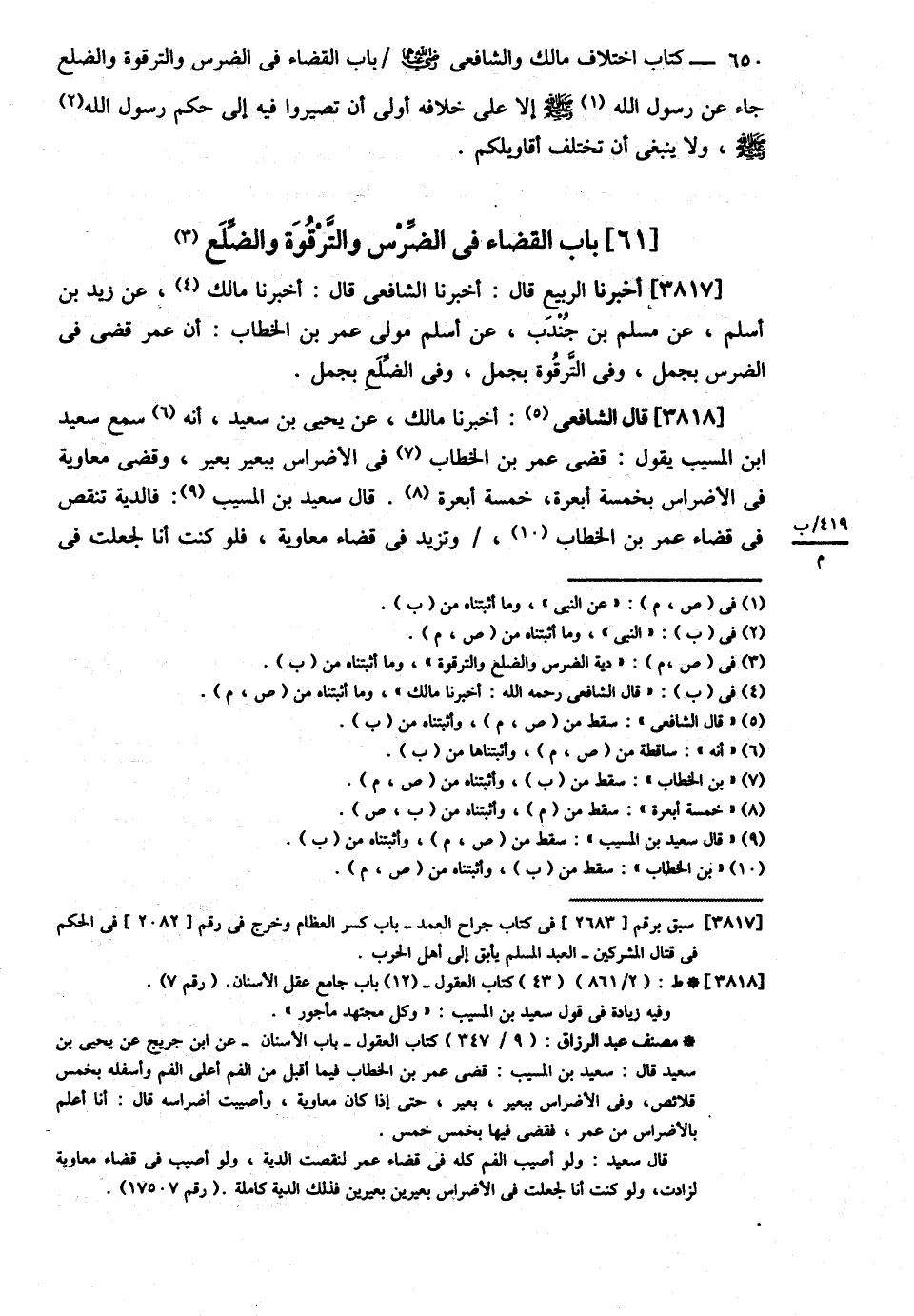 قَالَ الشَّافِعِيُّ : : رحمه الله تعالى أَخْبَرَنَا مَالِكٌ عَنْ زَيْدِ بْنِ أَسْلَمَ عَنْ مُسْلِمِ بْنِ جُنْدَبٍ عَنْ أَسْلَمَ مَوْلَى عُمَرَ بْنِ الْخَطَّابِ أَنَّ عُمَرَ قَضَى فِي الضِّرْسِ بِجَمَلٍ وَفِي التَّرْقُوَةِ بِجَمَلٍ وَفِي الضِّلَعِ بِجَمَلٍ .