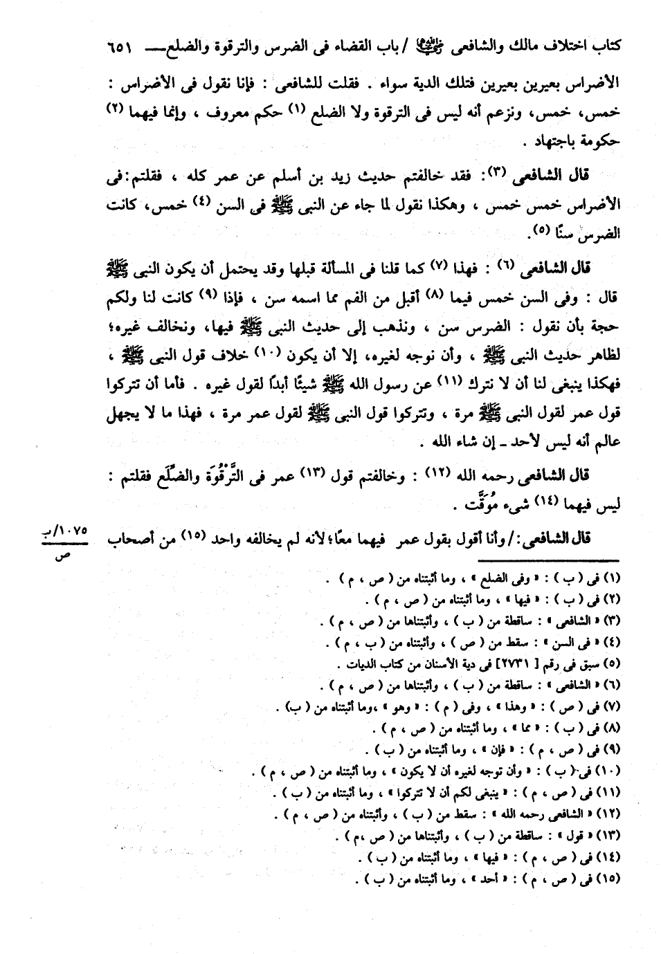 الْأَضْرَاسِ بَعِيرَيْنِ بَعِيرَيْنِ فَتِلْكَ الدِّيَةُ سَوَاءٌ فَقُلْت : لِلشَّافِعِيِّ : فَإِنَّا نَقُولُ فِي الْأَضْرَاسِ خَمْسٌ خَمْسٌ وَنَزْعُمُ أَنَّهُ لَيْسَ فِي التَّرْقُوَةِ وَفِي الضِّلْعِ حُكْمٌ مَعْرُوفٌ وَإِنَّمَا فِيهَا حُكُومَةٌ بِاجْتِهَادٍ قَالَ : فَقَدْ خَالَفْتُمْ حَدِيثَ زَيْدِ بْنِ أَسْلَمَ عَنْ عُمَرَ كُلَّهُ فَقُلْتُمْ فِي الْأَضْرَاسِ خَمْسٌ خَمْسٌ وَهَكَذَا نَقُولُ لِمَا جَاءَ عَنْ النَّبِيِّ - صلى الله عليه وسلم - فِي السِّنِّ خَمْسٌ كَانَتْ الضِّرْسُ سِنًّا قَالَ : فَهَذَا كَمَا قُلْنَا فِي الْمَسْأَلَةِ قَبْلَهَا وَقَدْ يَحْتَمِلُ أَنْ يَكُونَ النَّبِيُّ - صلى الله عليه وسلم - قَالَ : فِي السِّنِّ خَمْسٌ مِمَّا أَقْبَلَ مِنْ الْفَمِ مِمَّا اسْمُهُ سِنٌّ فَإِذَا كَانَتْ لَنَا وَلَكُمْ حُجَّةٌ بِأَنْ نَقُولَ : الضِّرْسُ سِنٌّ وَنَذْهَبَ إلَى حَدِيثِ النَّبِيِّ - صلى الله عليه وسلم - فِيهَا وَنُخَالِفَ غَيْرَهُ لِظَاهِرِ حَدِيثِ النَّبِيِّ - صلى الله عليه وسلم - وَإِنْ تَوَجَّهَ لِغَيْرِهِ أَنْ لاَ يَكُونَ خِلاَفَ قَوْلِ النَّبِيِّ - صلى الله عليه وسلم - فَهَكَذَا يَنْبَغِي لَنَا أَنْ لاَ نَتْرُكَ عَنْ رَسُولِ اللَّهِ - صلى الله عليه وسلم - شَيْئًا أَبَدًا لِقَوْلِ غَيْرِهِ فَأَمَّا أَنْ تَتْرُكُوا قَوْلَ عُمَرَ لِقَوْلِ النَّبِيِّ - صلى الله عليه وسلم - مَرَّةً وَتَتْرُكُوا قَوْلَ النَّبِيِّ - صلى الله عليه وسلم - لِقَوْلِ عُمَرَ مَرَّةً فَهَذَا مَا لاَ يَجْهَلُ عَالِمٌ أَنَّهُ لَيْسَ لِأَحَدٍ إنْ شَاءَ اللَّهُ . قَالَ : وَخَالَفْتُمْ عُمَرَ فِي التَّرْقُوَةِ وَالضِّلْعِ فَقُلْتُمْ : لَيْسَ فِيهِمَا شَيْءٌ مُوَقَّتٌ .