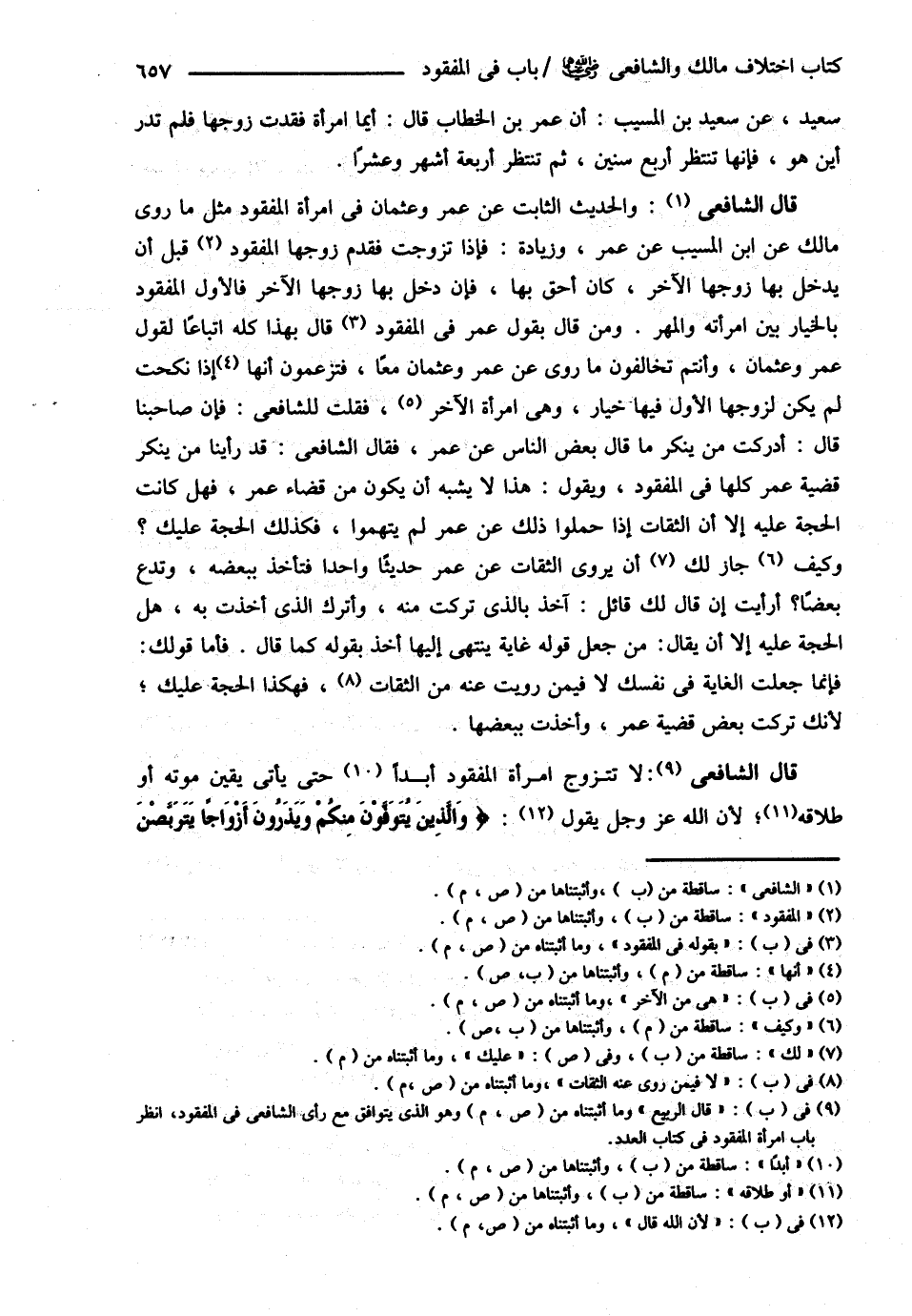 سَعِيدٍ عَنْ سَعِيدِ بْنِ الْمُسَيِّبِ أَنَّ عُمَرَ بْنَ الْخَطَّابِ قَالَ : أَيُّمَا امْرَأَةٍ فَقَدَتْ زَوْجَهَا فَلَمْ تَدْرِ أَيْنَ هُوَ فَإِنَّهَا تَنْتَظِرُ أَرْبَعَ سِنِينَ ثُمَّ تَنْتَظِرُ أَرْبَعَةَ أَشْهُرٍ وَعَشْرًا قَالَ : وَالْحَدِيثُ الثَّابِتُ عَنْ عُمَرَ وَعُثْمَانَ فِي امْرَأَةِ الْمَفْقُودِ مِثْلُ مَا رَوَى مَالِكٌ عَنْ ابْنِ الْمُسَيِّبِ عَنْ عُمَرَ وَزِيَادَةٌ فَإِذَا تَزَوَّجَتْ فَقَدِمَ زَوْجُهَا قَبْلَ أَنْ يَدْخُلَ بِهَا زَوْجُهَا الْآخِرُ كَانَ أَحَقَّ بِهَا فَإِنْ دَخَلَ بِهَا زَوْجُهَا الْآخِرُ فَالْأَوَّلُ الْمَفْقُودُ بِالْخِيَارِ بَيْنَ امْرَأَتِهِ وَالْمَهْرِ وَمَنْ قَالَ بِقَوْلِهِ فِي الْمَفْقُودِ قَالَ بِهَذَا كُلِّهِ اتِّبَاعًا لِقَوْلِ عُمَرَ وَعُثْمَانَ وَأَنْتُمْ تُخَالِفُونَ مَا رُوِيَ عَنْ عُمَرَ وَعُثْمَانَ مَعًا فَتَزْعُمُونَ أَنَّهَا إذَا نَكَحَتْ لَمْ يَكُنْ لِزَوْجِهَا الْأَوَّلِ فِيهَا خِيَارٌ هِيَ مِنْ الْآخِرِ , فَقُلْت لِلشَّافِعِيِّ فَإِنَّ صَاحِبَنَا قَالَ : أَدْرَكْت مَنْ يُنْكِرُ مَا قَالَ بَعْضُ النَّاسِ عَنْ عُمَرَ فَقَالَ الشَّافِعِيُّ : قَدْ رَأَيْنَا مَنْ يُنْكِرُ قَضِيَّةَ عُمَرَ كُلَّهَا فِي الْمَفْقُودِ وَيَقُولُ هَذَا لاَ يُشْبِهُ أَنْ يَكُونَ مِنْ قَضَاءِ عُمَرَ فَهَلْ كَانَتْ الْحُجَّةُ عَلَيْهِ إلَّا أَنَّ الثِّقَاتِ إذَا حَمَلُوا ذَلِكَ عَنْ عُمَرَ لَمْ يُتَّهَمُوا فَكَذَلِكَ الْحُجَّةُ عَلَيْك وَكَيْفَ جَازَ أَنْ يَرْوِيَ الثِّقَاتُ عَنْ عُمَرَ حَدِيثًا وَاحِدًا فَتَأْخُذَ بِبَعْضِهِ وَتَدَعَ بَعْضًا أَرَأَيْت إنْ قَالَ لَك قَائِلٌ : آخُذُ بِاَلَّذِي تَرَكْت مِنْهُ وَأَتْرُكُ الَّذِي أَخَذْت بِهِ هَلْ الْحُجَّةُ عَلَيْهِ إلَّا أَنْ يُقَالَ مَنْ جَعَلَ قَوْلَهُ غَايَةً يَنْتَهِي إلَيْهَا أَخَذَ بِقَوْلِهِ كَمَا قَالَ : فَأَمَّا قَوْلُك فَإِنَّمَا جَعَلْت الْغَايَةَ فِي نَفْسِك لاَ فِيمَنْ رَوَى عَنْهُ الثِّقَاتُ فَهَكَذَا الْحُجَّةُ عَلَيْك لِأَنَّك تَرَكْت بَعْضَ قَضِيَّةِ عُمَرَ وَأَخَذْت بِبَعْضِهَا ( قَالَ الرَّبِيعُ ) : لاَ تَتَزَوَّجُ امْرَأَةُ الْمَفْقُودِ حَتَّى يَأْتِيَ يَقِينُ مَوْتِهِ لِأَنَّ اللَّهَ قَالَ : : ? وَاَلَّذِينَ يُتَوَفَّوْنَ مِنْكُمْ وَيَذَرُونَ أَزْوَاجًا ?@