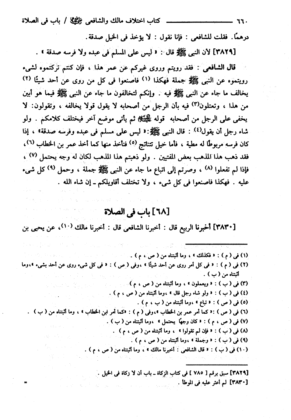قَالَ الشَّافِعِيُّ : : فَقَدْ رَوَيْتُمْ وَرَوَى غَيْرُكُمْ عَنْ عُمَرَ هَذَا فَإِنْ كُنْتُمْ تَرَكْتُمُوهُ لِشَيْءٍ رَوَيْتُمُوهُ عَنْ النَّبِيِّ - صلى الله عليه وسلم - جُمْلَةً فَهَكَذَا فَاصْنَعُوا فِي كُلِّ مَنْ رَوَى عَنْ أَحَدٍ شَيْئًا يُخَالِفُ مَا جَاءَ عَنْ النَّبِيِّ - صلى الله عليه وسلم - فِيهِ وَإِنَّكُمْ لَتُخَالِفُونَ مَا جَاءَ عَنْ النَّبِيِّ - صلى الله عليه وسلم - فِيمَا هُوَ أَبْيَنُ مِنْ هَذَا وَتَعْمَلُونَ فِيهِ بِأَنَّ الرَّجُلَ مِنْ أَصْحَابِهِ لاَ يَقُولُ قَوْلاً يُخَالِفُهُ وَتَقُولُونَ لاَ يَخْفَى عَلَى الرَّجُلِ مِنْ أَصْحَابِهِ قَوْلُهُ ثُمَّ يَأْتِي مَوْضِعٌ آخَرُ فَيَخْتَلِفُ كَلاَمُكُمْ وَلَوْ شَاءَ رَجُلٌ قَالَ : قَالَ النَّبِيُّ - صلى الله عليه وسلم - : ? لَيْسَ عَلَى مُسْلِمٍ فِي عَبْدِهِ وَفَرَسِهِ صَدَقَةٌ ? إذَا كَانَ فَرَسُهُ مَرْبُوطًا لَهُ مَطِيَّةً فَأَمَّا خَيْلٌ تَتَنَاتَجُ فَنَأْخُذُ مِنْهَا كَمَا أَخَذَ عُمَرُ بْنُ الْخَطَّابِ فَقَدْ ذَهَبَ هَذَا الْمَذْهَبَ بَعْضُ الْمُفْتِينَ وَلَوْ ذَهَبْتُمْ هَذَا الْمَذْهَبَ لَكَانَ لَهُ وَجْهٌ يُحْتَمَلُ فَإِنْ لَمْ تَقُولُوا وَصِرْتُمْ إلَى اتِّبَاعِ مَا جَاءَ عَنْ النَّبِيِّ - صلى الله عليه وسلم - جُمْلَةً وَجُمْلَةُ كُلِّ شَيْءٍ عَلَيْهِ فَهَكَذَا فَاصْنَعُوا فِي كُلِّ شَيْءٍ وَلاَ تَخْتَلِفُ أَقَاوِيلُكُمْ إنْ شَاءَ اللَّهُ .
