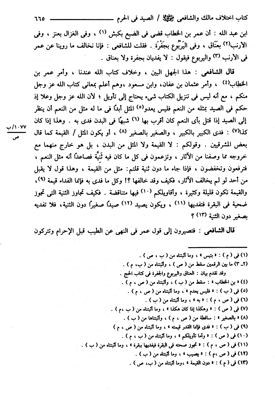 قَالَ الشَّافِعِيُّ:: هَذَا الْجَهْلُ الْبَيِّنُ وَخِلاَفُ كِتَابِ اللَّهِ عِنْدَنَا وَأَمْرِ عُمَرَ وَأَمْرِ عُثْمَانَ بْنِ عَفَّانَ وَابْنِ مَسْعُودٍ وَهُمْ أَعْلَمُ بِمَعَانِي كِتَابِ اللَّهِ مِنْكُمْ مَعَ أَنَّهُ لَيْسَ فِي تَنْزِيلِ الْكِتَابِ شَيْءٌ يَحْتَاجُ إلَى تَأْوِيلٍ لِأَنَّ اللَّهَ جَلَّ ثَنَاؤُهُ إذْ حَكَمَ فِي الصَّيْدِ بِمِثْلِهِ مِنْ النَّعَمِ فَلَيْسَ يُعْدَمُ الْمِثْلُ أَبَدًا فَمَا لَهُ مِثْلٌ مِنْ النَّعَمِ أَنْ يَنْظُرَ إلَى الصَّيْدِ إذَا قَتَلَ بِأَيِّ النَّعَمِ كَانَ أَقْرَبَ بِهَا شَبَهًا فِي الْبَدَنِ فَدَى بِهِ وَهَذَا إذَا كَانَ كَذَا فَدَى الْكَبِيرَ بِالْكَبِيرِ وَالصَّغِيرَ بِالصَّغِيرِ أَوْ يَكُونُ الْمِثْلُ الْقِيمَةَ كَمَا قَالَ بَعْضُ الْمَشْرِقِيِّينَ وَقَوْلُكُمْ لاَ الْقِيمَةُ وَلاَ الْمِثْلُ مِنْ الْبَدَنِ بَلْ هُوَ خَارِجٌ مِنْهُمَا مَعَ خُرُوجِهِ مِمَّا وَصَفْنَا مِنْ الْآثَارِ وَتَزْعُمُونَ فِي كُلِّ مَا كَانَ فِيهِ ثَنِيَّةٌ فَصَاعِدًا أَنَّهُ مِثْلُ النَّعَمِ فَتَرْفَعُونَ وَتَخْفِضُونَ فَإِذَا جَاءَ مَا دُونَ ثَنِيَّةٍ قُلْتُمْ مِثْلٌ مِنْ الْقِيمَةِ وَهَذَا قَوْلٌ لاَ يُقْبَلُ مِنْ أَحَدٍ لَوْ لَمْ يُخَالِفْ الْآثَارَ فَكَيْفَ وَقَدْ خَالَفَهَا وَكُلُّ مَا فَدَى فَإِنَّمَا الْقَدْرُ قِيمَتُهُ وَالْقِيمَةُ تَكُونُ قَلِيلَةً وَكَثِيرَةً وَأَقَاوِيلُكُمْ فِيهَا مُتَنَاقِضَةٌ فَكَيْفَ تُجَاوِزُ الثَّنِيَّةُ الَّتِي تَجُوزُ ضَحِيَّةً فِي الْبَقَرَةِ فَتَفْدِيهَا وَيَكُونُ يَصِيدُ صَيْدًا صَغِيرًا دُونَ الثَّنِيَّةِ فَلاَ تَفْدِيهِ بِصَغِيرٍ دُونَ الثَّنِيَّةِ.