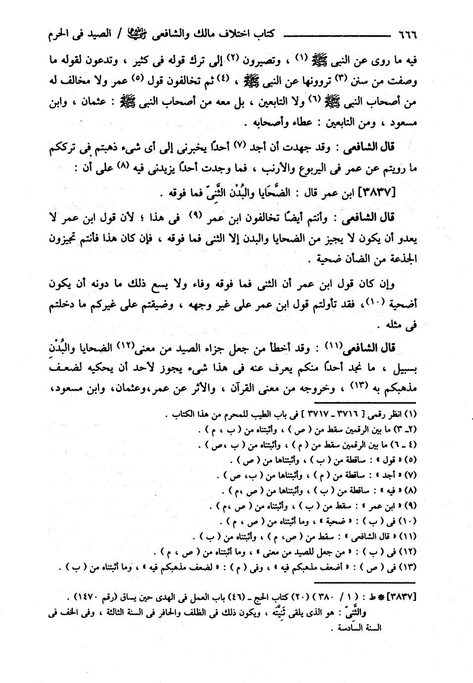 قَالَ الشَّافِعِيُّ : : وَقَدْ أَخْطَأَ مَنْ جَعَلَ الصَّيْدَ مِنْ مَعْنَى الضَّحَايَا وَالْبُدْنِ بِسَبِيلِ مَا نَجِدُ أَحَدًا مِنْكُمْ يُعْرَفُ عَنْهُ فِي هَذَا شَيْءٌ يَجُوزُ لِأَحَدٍ أَنْ يَحْكِيَهُ لِضَعْفِ مَذْهَبِكُمْ بِهِ وَخُرُوجِهِ مِنْ مَعْنَى الْقُرْآنِ وَالْأَثَرِ عَنْ عُمَرَ وَعُثْمَانَ وَابْنِ مَسْعُودٍ @