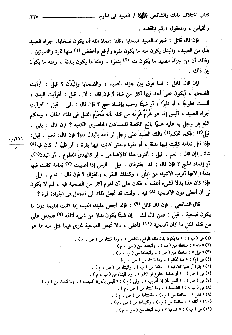 وَالْقِيَاسِ وَالْمَعْقُولِ ثُمَّ تَنَاقُضِهِ فَإِنْ قَالَ قَائِلٌ : فَجَزَاءُ الصَّيْدِ ضَحَايَا قُلْنَا : مَعَاذَ اللَّهِ أَنْ يَكُونَ ضَحَايَا جَزَاءِ الصَّيْدِ بَدَلٌ مِنْ الصَّيْدِ وَالْبَدَلُ يَكُونُ مِنْهُ مَا يَكُونُ بَقَرَةً مِثْلَهُ فَأَرْفَعُ وَأُخْفِضُ مِنْهَا تَمْرَةً وَالتَّمْرَتَيْنِ وَذَلِكَ أَنَّ مِنْ جَزَاءِ الصَّيْدِ مَا يَكُونُ بِتَمْرَةٍ وَمِنْهُ مَا يَكُونُ بِبَدَنَةٍ وَمِنْهُ مَا يَكُونُ بَيْنَ ذَلِكَ فَإِنْ قَالَ قَائِلٌ : فَمَا فَرَّقَ بَيْنَ جَزَاءِ الصَّيْدِ وَالضَّحَايَا وَالْبُدْنِ قِيلَ : أَرَأَيْت الضَّحَايَا أَيَكُونُ عَلَى أَحَدٍ فِيهَا أَكْثَرُ مِنْ شَاةٍ ؟ فَإِنْ قَالَ : لاَ قِيلَ أَفَرَأَيْت الْبُدْنَ أَلَيْسَتْ تَطَوُّعًا أَوْ نَذْرًا أَوْ شَيْئًا وَجَبَ بِإِفْسَادِ حَجٍّ ؟ فَإِنْ قَالَ : بَلَى قِيلَ : أَفَرَأَيْت جَزَاءَ الصَّيْدِ أَلَيْسَ إنَّمَا هُوَ غُرْمٌ وَغَرِمَهُ مَنْ قَتَلَهُ بِأَنَّهُ مُحَرَّمُ الْقَتْلِ فِي تِلْكَ الْحَالِ وَحَكَمَ اللَّهُ بِهِ عَلَيْهِ هَدْيًا بَالِغَ الْكَعْبَةِ لِلْمَسَاكِينِ الْحَاضِرِي الْكَعْبَةَ ؟ فَإِنْ قَالَ : بَلَى قِيلَ : فَكَمَا تَحْكُمُ لِمَالِكِ الصَّيْدِ عَلَى رَجُلٍ لَوْ قَتَلَهُ بِالْبُدْنِ مِنْهُ ؟ فَإِنْ قَالَ : نَعَمْ قِيلَ : فَإِذَا قَتَلَ نَعَامَةً كَانَتْ فِيهَا بَدَنَةٌ أَوْ بَقَرَةَ وَحْشٍ كَانَتْ فِيهَا شَاةٌ فَإِنْ قَالَ : نَعَمْ قِيلَ : أَفَتَرَى هَذَا كَالْأَضَاحِيِّ أَوْ كَالْهَدْيِ التَّطَوُّعِ أَوْ الْبُدْنِ أَوْ إفْسَادِ الْحَجِّ فَإِنْ قَالَ : قَدْ يَفْتَرِقَانِ قِيلَ : أَلَيْسَ إذَا أُصِيبَتْ نَعَامَةٌ كَانَتْ فِيهَا بَدَنَةٌ لِأَنَّهَا أَقْرَبُ الْأَشْيَاءِ مِنْ الْمِثْلِ وَكَذَلِكَ الْبَقَرُ وَالْغَزَالُ ؟ فَإِنْ قَالَ : نَعَمْ قِيلَ : فَإِذَا كَانَ هَذَا بَدَلاً لِشَيْءٍ أَتْلَفَ فَكَانَ عَلَيَّ أَنْ أُغَرِّمَ أَكْثَرَ مِنْ الضَّحِيَّةِ فِيهِ لِمَ لاَ يَكُونُ لِي أَنْ أُعْطِيَ دُونَ الضَّحِيَّةِ فِيهِ وَأَنْتَ قَدْ تَجْعَلُ ذَلِكَ لِي فَتَجْعَلُ فِي الْجَرَادَةِ تَمْرَةً ؟ .