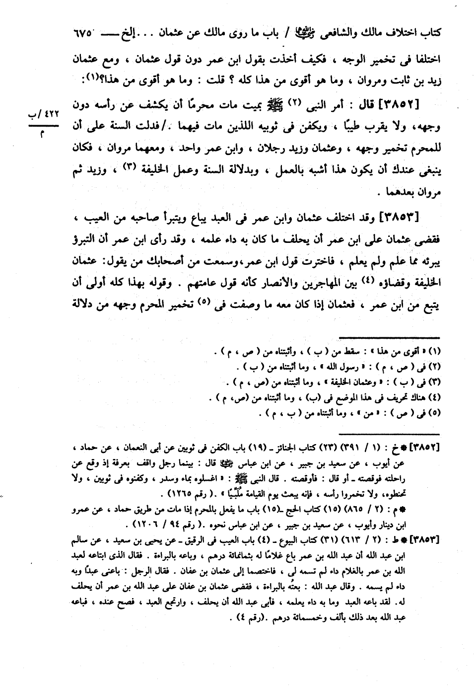 اخْتَلَفَا فِي تَخْمِيرِ الْوَجْهِ فَكَيْفَ أَخَذْت بِقَوْلِ ابْنِ عُمَرَ دُونَ قَوْلِ عُثْمَانَ وَمَعَ عُثْمَانَ زَيْدُ بْنُ ثَابِتٍ وَمَرْوَانُ وَمَا هُوَ أَقْوَى مِنْ هَذَا كُلِّهِ ؟ قُلْت وَمَا هُوَ ؟ قَالَ : : ? أَمَرَ النَّبِيُّ - صلى الله عليه وسلم - بِمَيِّتٍ مَاتَ مُحْرِمًا أَنْ يُكْشَفَ عَنْ رَأْسِهِ دُونَ وَجْهِهِ وَلاَ يَقْرَبُ طِيبًا وَيُكَفَّنُ فِي ثَوْبَيْهِ اللَّذَيْنِ مَاتَ فِيهِمَا ? فَدَلَّتْ السُّنَّةُ عَلَى أَنَّ لِلْمُحْرِمِ تَخْمِيرَ وَجْهِهِ وَعُثْمَانُ وَزَيْدٌ رَجُلاَنِ وَابْنُ عُمَرَ وَاحِدٌ وَمَعَهُمَا مَرْوَانُ فَكَانَ يَنْبَغِي عِنْدَك أَنْ يَكُونَ هَذَا أَشْبَهَ بِالْعَمَلِ وَبِدَلاَلَةِ السُّنَّةِ وَعُثْمَانُ الْخَلِيفَةُ وَزَيْدٌ ثُمَّ مَرْوَانُ بَعْدَهُمَا وَقَدْ اخْتَلَفَ عُثْمَانُ وَابْنُ عُمَرَ فِي الْعَبْدِ يُبَاعُ وَيَتَبَرَّأُ صَاحِبُهُ مِنْ الْعَيْبِ فَقَضَى عُثْمَانُ عَلَى ابْنِ عُمَرَ أَنْ يَحْلِفَ مَا كَانَ بِهِ دَاءٌ عَلِمَهُ وَقَدْ رَأَى ابْنُ عُمَرَ أَنَّ التَّبَرُّؤَ يُبَرِّئُهُ مِمَّا عَلِمَ لَمْ يَعْلَمْ فَاخْتَرْت قَوْلَ ابْنِ عُمَرَ وَسَمِعْت مِنْ أَصْحَابِك مَنْ يَقُولُ عُثْمَانُ الْخَلِيفَةُ عَنْ قَضَاهُ بَيْنَ الْمُهَاجِرِينَ وَالْأَنْصَارِ كَأَنَّهُ قَوْلُ عَامَّتِهِمْ وَقَوْلُهُ بِهَذَا كُلِّهِ أَوْلَى أَنْ يُتَّبَعَ مِنْ ابْنِ عُمَرَ فَعُثْمَانُ إذْ كَانَ مَعَهُ مَا وَصَفْت فِي تَخْمِيرِ الْمُحْرِمِ وَجْهَهُ مِنْ دَلاَلَةِ@