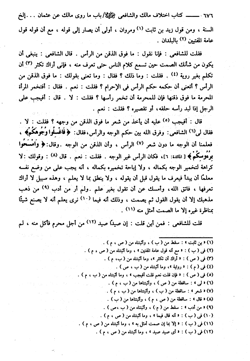 السُّنَّةِ وَمِنْ قَوْلِ زَيْدٍ وَمَرْوَانَ أَوْلَى أَنْ يُصَارَ إلَى قَوْلِهِ مَعَ أَنَّهُ قَوْلُ عَامَّةِ الْمُفْتِينَ بِالْبُلْدَانِ فَقُلْت : لِلشَّافِعِيِّ : فَإِنَّا نَقُولُ مَا فَوْقَ الذَّقَنِ مِنْ الرَّأْسِ . قَالَ الشَّافِعِيُّ : يَنْبَغِي أَنْ يَكُونَ مِنْ شَأْنِك الصَّمْتُ حِينَ تَسْمَعُ كَلاَمَ النَّاسِ حَتَّى تَعْرِفَ مِنْهُ فَإِنِّي أَرَاك تُكْثِرُ أَنْ تَكَلَّمَ بِغَيْرِ رَوِيَّةٍ فَقُلْت : وَمَا ذَلِكَ ؟ فَقَالَ : وَمَا تَعْنِي بِقَوْلِك وَمَا فَوْقَ الذَّقَنِ مِنْ الرَّأْسِ ؟ أَتَعْنِي أَنَّ حُكْمَهُ حُكْمُ الرَّأْسِ فِي الْإِحْرَامِ ؟ فَقُلْت : نَعَمْ فَقَالَ : أَفَتُخَمِّرُ الْمَرْأَةُ الْمُحْرِمَةُ مَا فَوْقَ ذَقَنِهَا فَإِنَّ لِلْمُحْرِمَةِ أَنْ تُخَمِّرَ رَأْسَهَا فَقُلْت : لاَ قَالَ : أَفَيَجِبُ عَلَى الرَّجُلِ إذَا لَبَّدَ رَأْسَهُ حَلْقُهُ أَوْ تَقْصِيرُهُ ؟ فَقُلْت : نَعَمْ قَالَ : أَفَيَجِبُ عَلَيْهِ أَنْ يَأْخُذَ مِنْ شَعْرِ مَا فَوْقَ الذَّقَنِ مِنْ وَجْهِهِ ؟ فَقُلْت : لاَ فَقَالَ لِي الشَّافِعِيُّ : وَفَرَّقَ اللَّهُ بَيْنَ حُكْمِ الْوَجْهِ وَالرَّأْسِ فَقَالَ : اغْسِلُوا وُجُوهَكُمْ فَعَلِمْنَا أَنَّ الْوَجْهَ مَا دُونَ الرَّأْسِ وَأَنَّ الذَّقَنَ مِنْ الْوَجْهِ وَقَالَ امْسَحُوا بِرُءُوسِكُمْ فَكَانَ الرَّأْسُ غَيْرَ الْوَجْهِ فَقُلْت : نَعَمْ قَالَ : وَقَوْلُك لاَ كَرَاهَةَ لِتَخْمِيرِ الْوَجْهِ بِكَمَالِهِ وَلاَ إبَاحَةَ تَخْمِيرِهِ بِكَمَالِهِ أَنَّهُ يَجِبُ عَلَى مَنْ وَضَعَ نَفْسَهُ مُعَلِّمًا أَنْ يَبْدَأَ فَيُعَرِّفَ مَا يَقُولُ قَبْلَ أَنْ يَقُولَهُ وَلاَ يَنْطِقَ بِمَا لاَ يَعْلَمُ وَهَذِهِ سَبِيلٌ لاَ أَرَاك تَعْرِفُهَا فَاتَّقِ اللَّهَ وَامْسِكْ عَنْ أَنْ تَقُولَ بِغَيْرِ عِلْمٍ وَلَمْ أَرَ مِنْ أَدَبِ مَنْ ذَهَبَ مَذْهَبَك إلَّا أَنْ يَقُولَ الْقَوْلَ ثُمَّ يَصْمُتُ وَذَلِكَ أَنَّهُ " قَالَ : فِيمَا نَرَى " يَعْلَمُ أَنَّهُ لاَ يَصْنَعُ شَيْئًا بِمُنَاظَرَةِ غَيْرِهِ إلَّا بِمَا أَنْ صَمَتَ أَمْثَلُ بِهِ . قُلْت لِلشَّافِعِيِّ : فَمِنْ أَيْنَ قُلْت أَيُّ صَيْدٍ صِيدَ مِنْ أَجْلِ مُحْرِمٍ فَأَكَلَ مِنْهُ لَمْ @