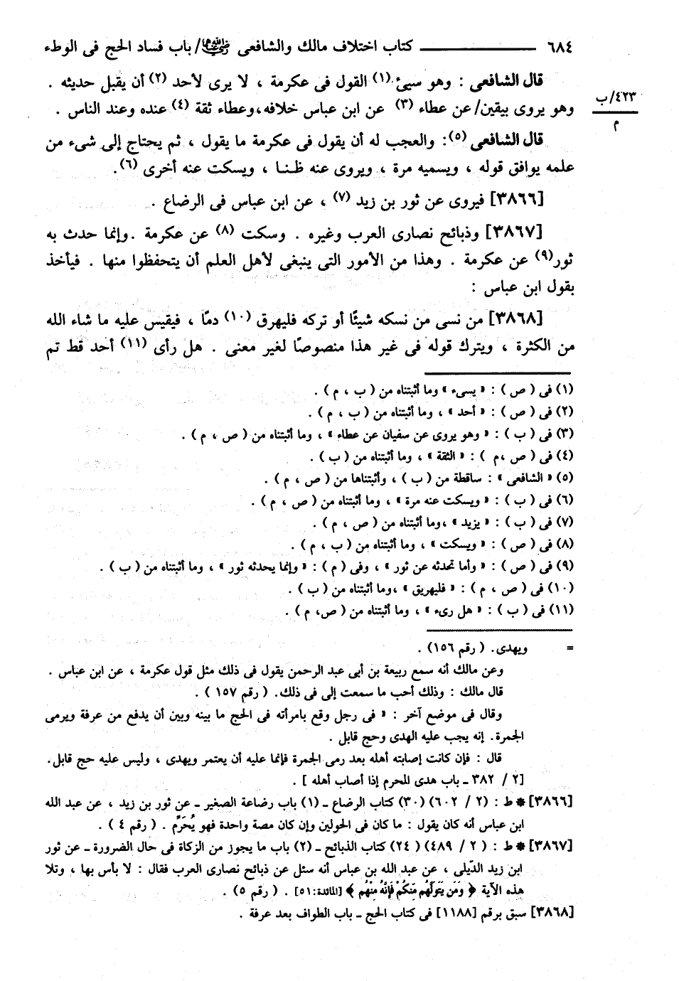 قَالَ الشَّافِعِيُّ : : وَهُوَ سَيِّئُ الْقَوْلِ فِي عِكْرِمَةَ لاَ يَرَى لِأَحَدٍ أَنْ يَقْبَلَ حَدِيثَهُ وَهُوَ يَرْوِي سُفْيَانُ عَنْ عَطَاءٍ عَنْ ابْنِ عَبَّاسٍ خِلاَفَهُ وَعَطَاءٌ ثِقَةٌ عِنْدَهُ وَعِنْدَ النَّاسِ قَالَ : وَالْعَجَبُ لَهُ أَنْ يَقُولَ فِي عِكْرِمَةَ مَا يَقُولُ ثُمَّ يَحْتَاجُ إلَى شَيْءٍ مِنْ عِلْمِهِ يُوَافِقُ قَوْلَهُ وَيُسَمِّيهِ مَرَّةً وَيَرْوِي عَنْهُ ظَنًّا وَيَسْكُتُ عَنْهُ مَرَّةً فَيَرْوِي عَنْ ثَوْرِ بْنِ يَزِيدَ عَنْ ابْنِ عَبَّاسٍ فِي الرَّضَاعِ وَذَبَائِحِ نَصَارَى الْعَرَبِ وَغَيْرِهِ وَسَكَتَ عَنْ عِكْرِمَةَ وَإِنَّمَا حَدَّثَ بِهِ ثَوْرٌ عَنْ عِكْرِمَةَ وَهَذَا مِنْ الْأُمُورِ الَّتِي يَنْبَغِي لِأَهْلِ الْعِلْمِ أَنْ يَتَحَفَّظُوا مِنْهَا فَيَأْخُذُ بِقَوْلِ ابْنِ عَبَّاسٍ مَنْ نَسِيَ مِنْ نُسُكِهِ شَيْئًا أَوْ تَرَكَهُ فَلْيُهْرِقْ دَمًا فَيَقِيسُ عَلَيْهِ مَا شَاءَ اللَّهُ مِنْ الْكَثْرَةِ وَيَتْرُكُ قَوْلَهُ فِي غَيْرِ هَذَا مَنْصُوصًا لِغَيْرِ مَعْنًى هَلْ رَأَى أَحَدًا قَطُّ تَمَّ @