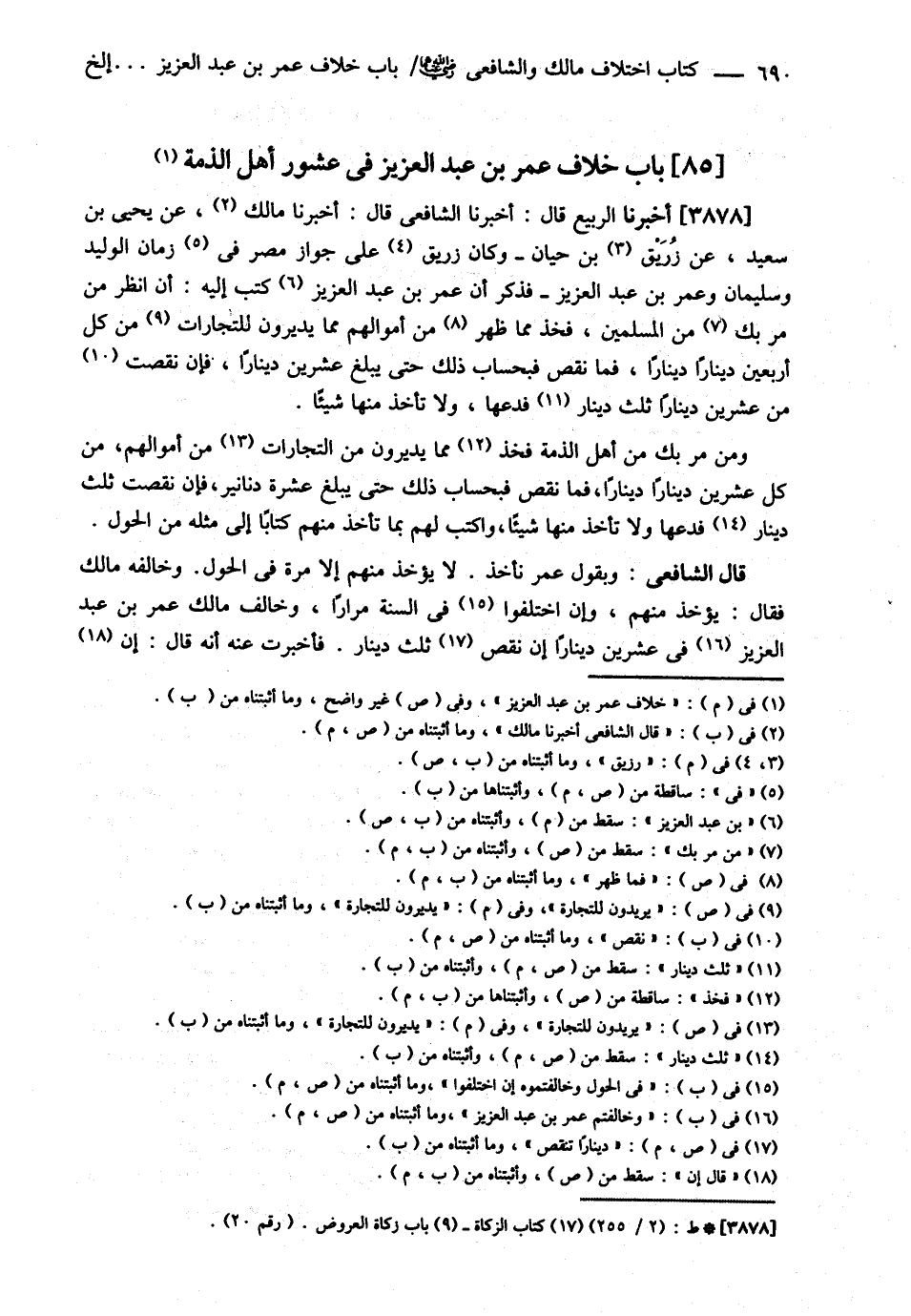 قَالَ الشَّافِعِيُّ : : أَخْبَرَنَا مَالِكٌ عَنْ يَحْيَى بْنِ سَعِيدٍ عَنْ زُرَيْقِ بْنِ حَيَّانَ وَكَانَ زُرَيْقٌ عَلَى جَوَازِ مِصْرَ فِي زَمَانِ الْوَلِيدِ وَسُلَيْمَانَ وَعُمَرَ بْنِ عَبْدِ الْعَزِيزِ فَذَكَرَ أَنَّ عُمَرَ بْنَ عَبْدِ الْعَزِيزِ كَتَبَ إلَيْهِ أَنْ اُنْظُرْ مَنْ مَرَّ بِك مِنْ الْمُسْلِمِينَ فَخُذْ مِمَّا ظَهَرَ مِنْ أَمْوَالِهِمْ مِمَّا يُدِيرُونَ لِلتِّجَارَاتِ مِنْ كُلِّ أَرْبَعِينَ دِينَارًا دِينَارًا فَمَا نَقَصَ فَبِحِسَابِ ذَلِكَ حَتَّى يَبْلُغَ عِشْرِينَ دِينَارًا فَإِنْ نَقَصَ مِنْ عِشْرِينَ دِينَارًا ثُلُثُ دِينَارٍ فَدَعْهَا وَلاَ تَأْخُذْ مِنْهَا شَيْئًا وَمَنْ مَرَّ بِك مِنْ أَهْلِ الذِّمَّةِ فَخُذْ مِمَّا يُدِيرُونَ مِنْ التِّجَارَاتِ مِنْ أَمْوَالِهِمْ مِنْ كُلِّ عِشْرِينَ دِينَارًا دِينَارًا فَمَا نَقَصَ فَبِحِسَابِ ذَلِكَ حَتَّى يَبْلُغَ عَشْرَةَ دَنَانِيرَ فَإِنْ نَقَصَتْ ثُلُثَ دِينَارٍ فَدَعْهَا وَلاَ تَأْخُذْ مِنْهَا شَيْئًا وَاكْتُبْ لَهُمْ بِمَا تَأْخُذُ مِنْهُمْ كِتَابًا إلَى مِثْلِهِ مِنْ الْحَوْلِ