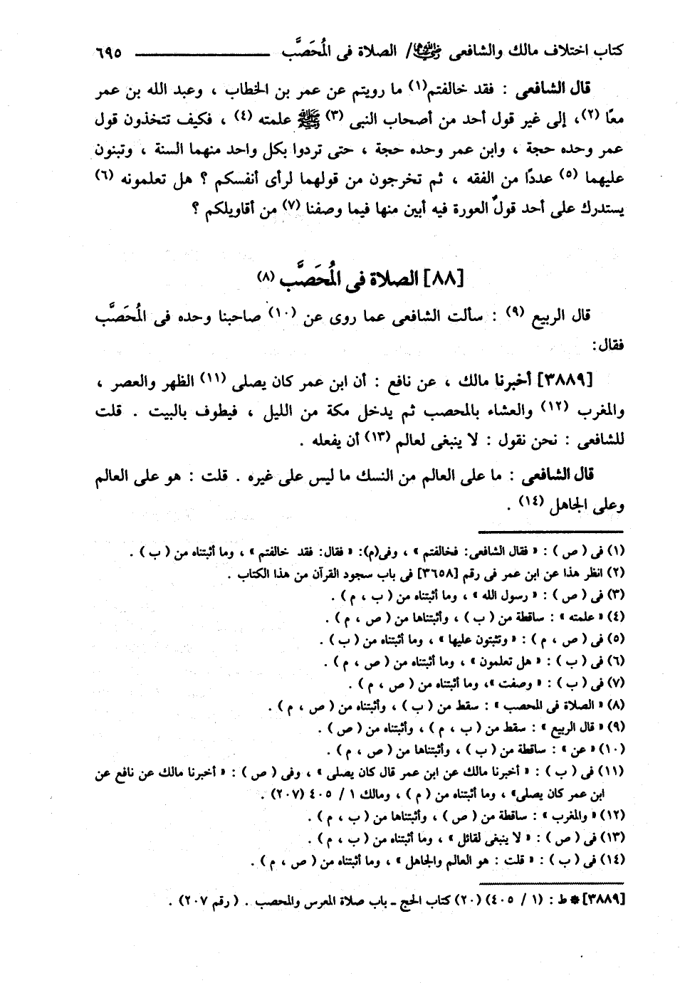 قَالَ الشَّافِعِيُّ : : فَقَدْ خَالَفْتُمْ مَا رَوَيْتُمْ عَنْ عُمَرَ بْنِ الْخَطَّابِ وَعَبْدِ اللَّهِ بْنِ عُمَرَ مَعًا إلَى غَيْرِ قَوْلِ أَحَدٍ مِنْ أَصْحَابِ النَّبِيِّ - صلى الله عليه وسلم - فَكَيْفَ تَتَّخِذُونَ قَوْلَ عُمَرَ وَحْدَهُ حُجَّةً وَابْنِ عُمَرَ وَحْدَهُ حُجَّةً حَتَّى تَرُدُّوا بِكُلِّ وَاحِدٍ مِنْهُمَا السُّنَّةَ وَتَبْنُونَ عَلَيْهِمَا عَدَدًا مِنْ الْفِقْهِ ثُمَّ تَخْرُجُونَ مِنْ قَوْلِهِمَا لِرَأْيِ أَنْفُسِكُمْ هَلْ تَعْلَمُونَ يُسْتَدْرَكُ عَلَى أَحَدٍ قَوْلٌ الْعَوْرَةُ فِيهِ أَبْيَنُ مِنْهَا فِيمَا وَصَفْت مِنْ أَقَاوِيلِكُمْ , وَسَأَلْتُ الشَّافِعِيَّ عَمَّا رَوَى صَاحِبُنَا وَحْدَهُ فِي الْمُحَصَّبِ فَقَالَ : أَخْبَرَنَا مَالِكٌ عَنْ ابْنِ عُمَرَ قَالَ : كَانَ يُصَلِّي الظُّهْرَ وَالْعَصْرَ وَالْمَغْرِبَ وَالْعِشَاءَ بِالْمُحَصَّبِ ثُمَّ يَدْخُلُ مَكَّةَ مِنْ اللَّيْلِ فَيَطُوفُ بِالْبَيْتِ , قُلْت لِلشَّافِعِيِّ : نَحْنُ نَقُولُ لاَ يَنْبَغِي لِعَالِمٍ أَنْ يَفْعَلَهُ