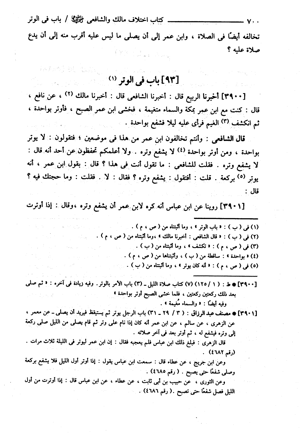 قَالَ الشَّافِعِيُّ : : وَأَنْتُمْ تُخَالِفُونَ ابْنَ عُمَرَ مِنْ هَذَا فِي مَوْضِعَيْنِ فَتَقُولُونَ : لاَ يُوتَرُ بِوَاحِدَةٍ وَمَنْ أَوْتَرَ لاَ يَشْفَعُ وِتْرَهُ وَلاَ أَعْلَمُكُمْ تَحْفَظُونَ عَنْ أَحَدٍ أَنَّهُ قَالَ : لاَ يَشْفَعُ وِتْرَهُ فَقُلْت لِلشَّافِعِيِّ : مَا تَقُولُ أَنْتَ فِي هَذَا ؟ قَالَ : بِقَوْلِ ابْنِ عُمَرَ أَنَّهُ يُوتِرُ بِرَكْعَةٍ , قُلْت : أَفَتَقُولُ يَشْفَعُ وِتْرَهُ ؟ فَقَالَ : لاَ فَقُلْت : وَمَا حُجَّتُك فِيهِ ؟ قَالَ : رَوَيْنَا عَنْ ابْنِ عَبَّاسٍ أَنَّهُ كَرِهَ لِابْنِ عُمَرَ أَنْ يَشْفَعَ وِتْرَهُ وَقَالَ : إذَا أَوْتَرْت@