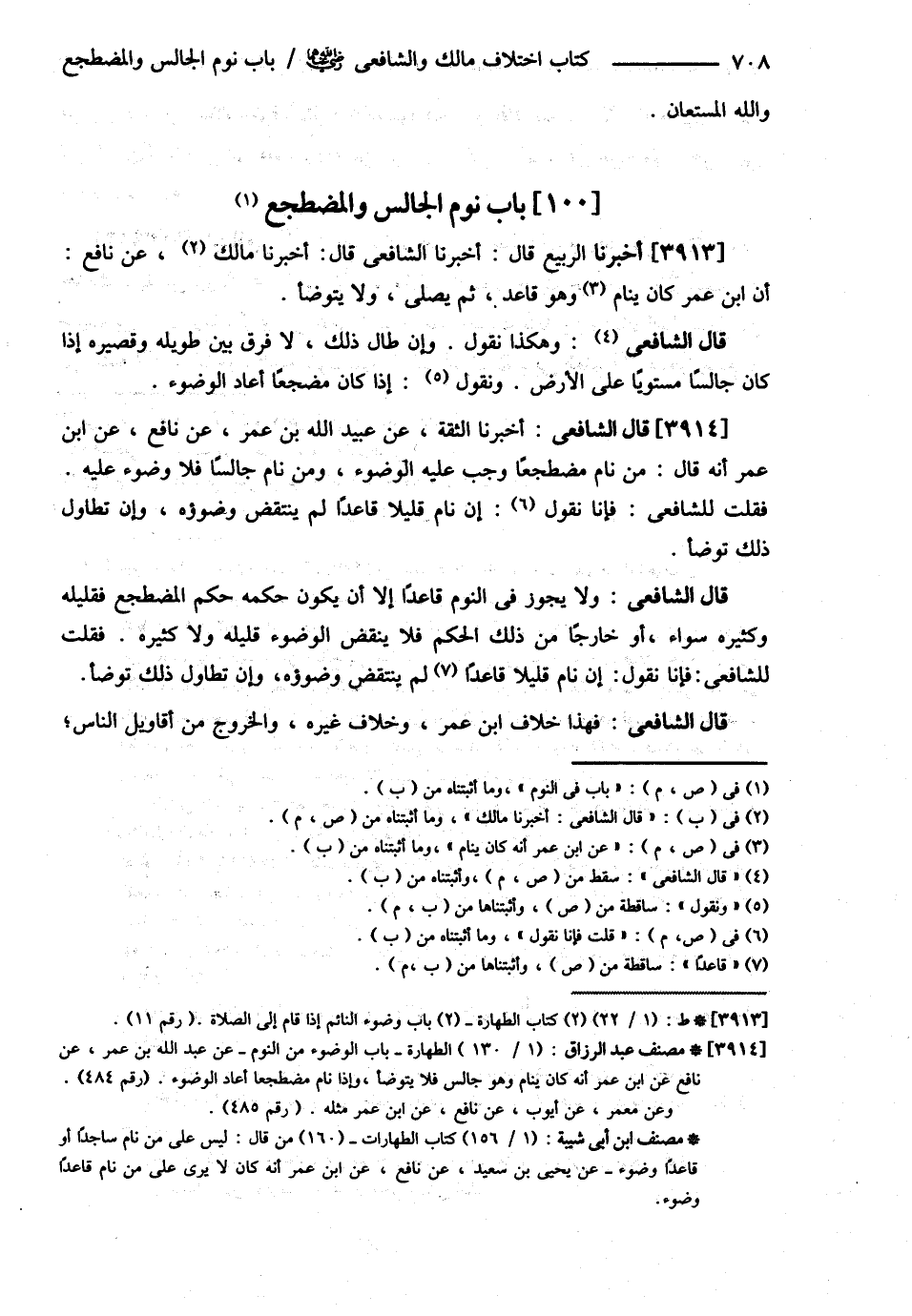 قَالَ الشَّافِعِيُّ : : أَخْبَرَنَا مَالِكٌ عَنْ نَافِعٍ أَنَّ ابْنَ عُمَرَ كَانَ يَنَامُ وَهُوَ قَاعِدٌ ثُمَّ يُصَلِّي وَلاَ يَتَوَضَّأُ