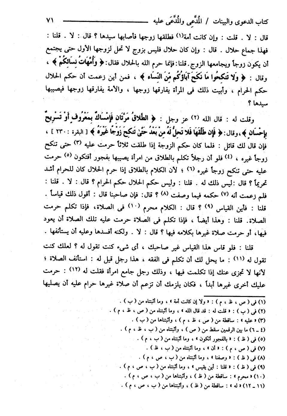 ؟ قَالَ : لاَ قُلْت وَإِنْ كَانَتْ أَمَةً فَطَلَّقَهَا زَوْجُهَا , فَأَصَابَهَا سَيِّدُهَا ؟ قَالَ لاَ قُلْنَا فَهَذَا جِمَاعٌ حَلاَلٌ قَالَ وَإِنْ كَانَ حَلاَلاً فَلَيْسَ بِزَوْجٍ لاَ تَحِلُّ لِزَوْجِهَا الْأَوَّلِ حَتَّى يَجْتَمِعَ أَنْ يَكُونَ زَوْجًا وَيُجَامِعُهَا الزَّوْجُ قُلْنَا فَإِنَّمَا حَرَّمَ اللَّهُ بِالْحَلاَلِ فَقَالَ : ? وَأُمَّهَاتُ نِسَائِكُمْ ? وَقَالَ : ? وَلاَ تَنْكِحُوا مَا نَكَحَ آبَاؤُكُمْ مِنْ النِّسَاءِ ? فَمِنْ أَيْنَ زَعَمْت أَنَّ حُكْمَ الْحَلاَلِ حُكْمُ الْحَرَامِ وَأَبَيْت ذَلِكَ فِي الْمَرْأَةِ يُفَارِقُهَا زَوْجُهَا , وَالْأَمَةُ يُفَارِقُهَا زَوْجُهَا فَيُصِيبُهَا سَيِّدُهَا ؟ وَقُلْت لَهُ قَدْ قَالَ اللَّهُ عَزَّ وَجَلَّ : ? الطَّلاَقُ مَرَّتَانِ فَإِمْسَاكٌ بِمَعْرُوفٍ أَوْ تَسْرِيحٌ بِإِحْسَانٍ ? وَقَالَ : ? فَإِنْ طَلَّقَهَا فَلاَ تَحِلُّ لَهُ مِنْ بَعْدُ حَتَّى تَنْكِحَ زَوْجًا غَيْرَهُ ? فَإِنْ قَالَ لَك قَائِلٌ فَلَمَّا كَانَ حُكْمُ الزَّوْجَةِ إذَا طَلُقَتْ ثَلاَثًا حُرِّمَتْ عَلَيْهِ حَتَّى تَنْكِحَ زَوْجًا غَيْرَهُ فَلَوْ أَنَّ رَجُلاً تَكَلَّمَ بِالطَّلاَقِ مِنْ امْرَأَةٍ يُصِيبُهَا بِفُجُورٍ أَفَتَكُونُ حُرِّمَتْ عَلَيْهِ حَتَّى تَنْكِحَ زَوْجًا غَيْرَهُ ; لِأَنَّ الْكَلاَمَ بِالطَّلاَقِ إذَا حَرَّمَ الْحَلاَلَ كَانَ لِلْحَرَامِ أَشَدَّ تَحْرِيمًا ؟ قَالَ لَيْسَ ذَلِكَ لَهُ قُلْنَا وَلَيْسَ حُكْمُ الْحَلاَلِ حُكْمَ الْحَرَامِ ؟ قَالَ : لاَ , قُلْنَا فَلِمَ زَعَمْت أَنَّهُ حُكْمُهُ فِيمَا وَصَفْت ؟ قَالَ فَإِنَّ صَاحِبَنَا قَالَ أَقُولُ ذَلِكَ قِيَاسًا قُلْنَا فَأَيْنَ الْقِيَاسُ ؟ قَالَ الْكَلاَمُ مُحَرَّمٌ فِي الصَّلاَةِ فَإِذَا تَكَلَّمَ حُرِّمَتْ الصَّلاَةُ قُلْنَا وَهَذَا أَيْضًا فَإِذَا تَكَلَّمَ فِي الصَّلاَةِ حُرِّمَتْ عَلَيْهِ تِلْكَ الصَّلاَةُ أَنْ يَعُودَ فِيهَا , أَوْ حُرِّمَتْ صَلاَةُ غَيْرِهَا بِكَلاَمِهِ فِيهَا ؟ قَالَ لاَ وَلَكِنَّهُ أَفْسَدَهَا وَعَلَيْهِ أَنْ يَسْتَأْنِفَهَا قُلْنَا فَلَوْ قَاسَ هَذَا الْقِيَاسَ غَيْرُ صَاحِبِك أَيُّ شَيْءٍ كُنْت تَقُولُ لَهُ ؟ لَعَلَّك كُنْت تَقُولُ لَهُ مَا يَحِلُّ لَك تَكَلُّمٌ فِي الْفِقْهِ هَذَا رَجُلٌ قِيلَ لَهُ اسْتَأْنِفْ الصَّلاَةَ ; لِأَنَّهَا لاَ تَجْزِي عَنْك إذَا تَكَلَّمْت فِيهَا . وَذَلِكَ رَجُلٌ جَامَعَ امْرَأَةً فَقُلْت لَهُ حُرِّمَتْ عَلَيْك أُخْرَى غَيْرُهَا أَبَدًا فَكَانَ يَلْزَمُك أَنْ تَزْعُمَ أَنَّ صَلاَةَ غَيْرِهَا حَرَامٌ عَلَيْهِ أَنْ يُصَلِّيَهَا@