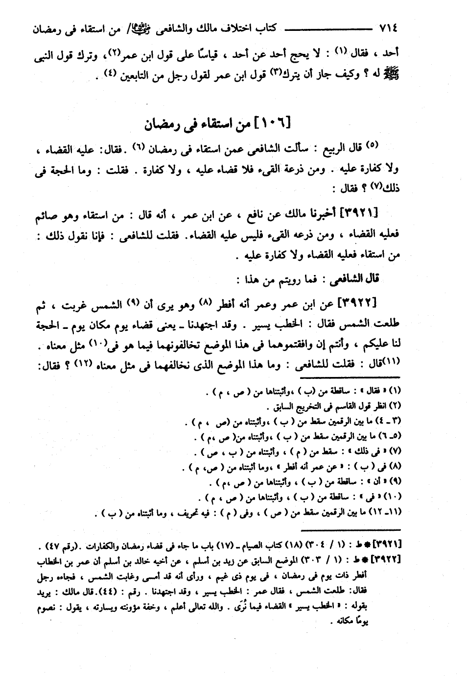 قَالَ الشَّافِعِيُّ : : فَمَا رَوَيْتُمْ مِنْ هَذَا عَنْ عُمَرَ أَنَّهُ أَفْطَرَ وَهُوَ يَرَى الشَّمْسَ غَرَبَتْ ثُمَّ طَلَعَتْ فَقَالَ : الْخَطْبُ يَسِيرٌ وَقَدْ اجْتَهَدْنَا - يَعْنِي قَضَاءَ يَوْمٍ مَكَانَ يَوْمٍ - الْحُجَّةُ لَنَا عَلَيْكُمْ وَأَنْتُمْ إنْ وَافَقْتُمُوهُمَا فِي هَذَا الْمَوْضُوعِ تُخَالِفُونَهُمَا فِيمَا هُوَ مِثْلُ مَعْنَاهُ قَالَ : فَقُلْت لِلشَّافِعِيِّ وَمَا هَذَا الْمَوْضِعُ الَّذِي نُخَالِفُهُمَا فِي مِثْلِ مَعْنَاهُ ؟ فَقَالَ : @