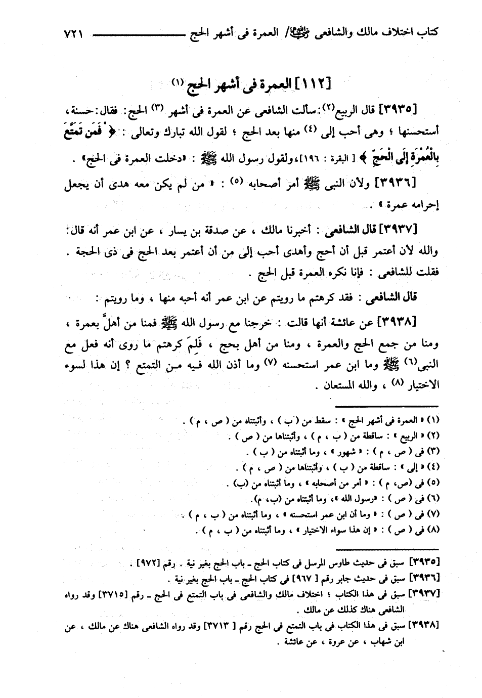 قَالَ الشَّافِعِيُّ : : أَخْبَرَنَا مَالِكٌ عَنْ صَدَقَةَ بْنِ يَسَارٍ عَنْ ابْنِ عُمَرَ أَنَّهُ قَالَ : وَاَللَّهِ لاََنْ أَعْتَمِرَ قَبْلَ أَنْ أَحُجَّ وَأُهْدِي أَحَبُّ إلَيَّ مِنْ أَنْ أَعْتَمِرَ بَعْدَ الْحَجِّ فِي ذِي الْحِجَّةِ فَقُلْت لِلشَّافِعِيِّ : فَإِنَّا نَكْرَهُ الْعُمْرَةَ قَبْلَ الْحَجِّ