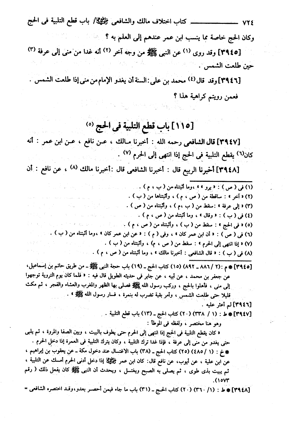 قَالَ الشَّافِعِيُّ : رحمه الله تعالى : أَخْبَرَنَا مَالِكٌ عَنْ نَافِعٍ عَنْ ابْنِ عُمَرَ أَنَّهُ كَانَ يَقْطَعُ التَّلْبِيَةَ فِي الْحَجِّ إذَا انْتَهَى إلَى الْحَرَمِ