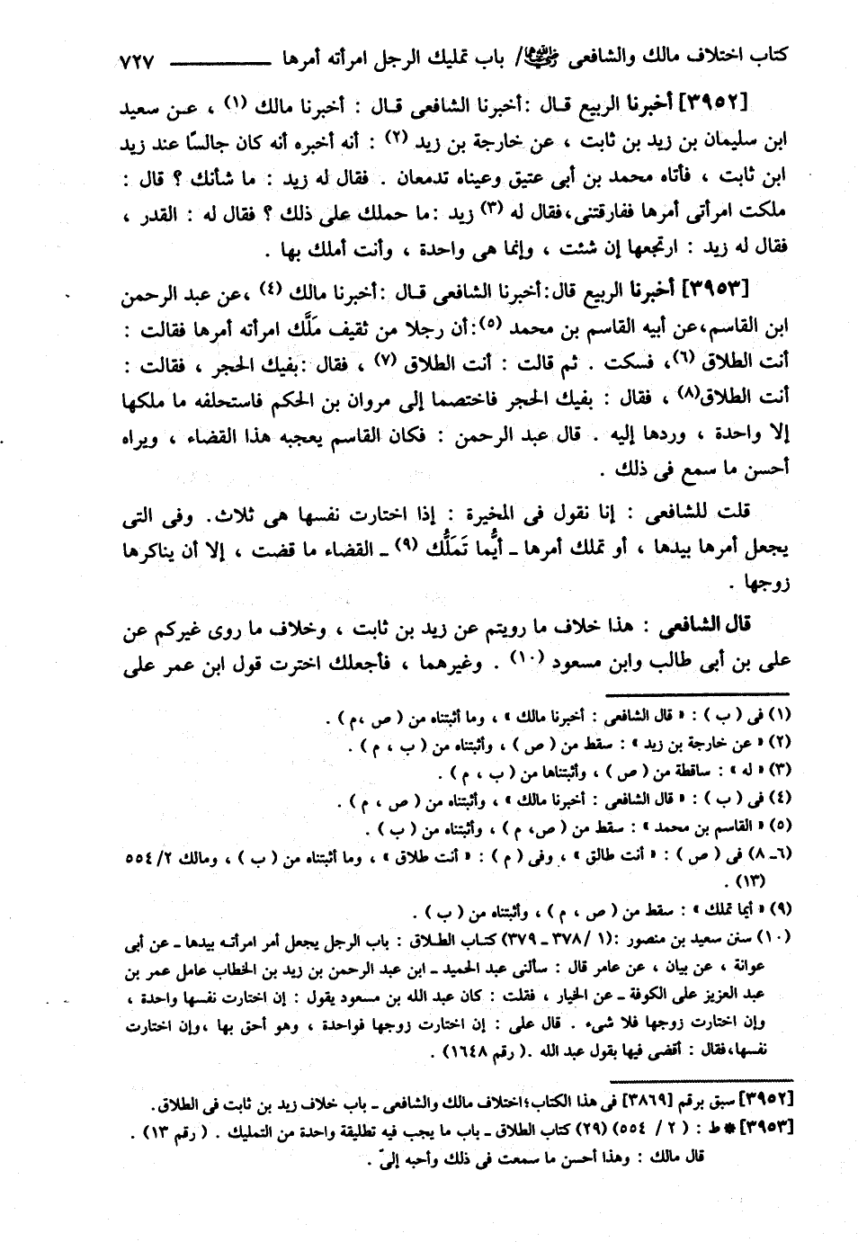 قَالَ الشَّافِعِيُّ : : أَخْبَرَنَا مَالِكٌ عَنْ سَعِيدِ بْنِ سُلَيْمَانَ بْنِ زَيْدِ بْنِ ثَابِتٍ عَنْ خَارِجَةَ بْنِ زَيْدٍ أَنَّهُ أَخْبَرَهُ أَنَّهُ كَانَ جَالِسًا عِنْدَ زَيْدِ بْنِ ثَابِتٍ فَأَتَاهُ مُحَمَّدُ بْنُ أَبِي عَتِيقٍ وَعَيْنَاهُ تَدْمَعَانِ . فَقَالَ لَهُ زَيْدٌ : مَا شَأْنُك ؟ قَالَ : مَلَّكْت امْرَأَتِي أَمْرَهَا فَفَارَقَتْنِي فَقَالَ لَهُ زَيْدٌ : مَا حَمَلَك عَلَى ذَلِكَ ؟ فَقَالَ لَهُ : الْقَدْرُ فَقَالَ لَهُ زَيْدٌ : ارْتَجِعْهَا إنْ شِئْت وَإِنَّمَا هِيَ وَاحِدَةٌ وَأَنْتَ أَمْلَكُ بِهَا
