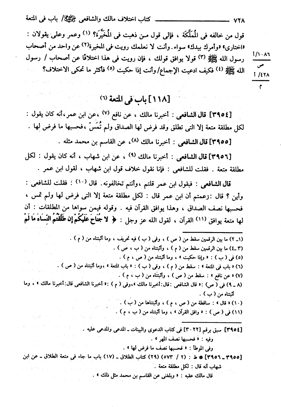 قَالَ الشَّافِعِيُّ : : فَبِقَوْلِ ابْنِ عُمَرَ قُلْتُمْ وَأَنْتُمْ تُخَالِفُونَهُ قَالَ : فَقُلْت لِلشَّافِعِيِّ وَأَيْنَ ؟ قَالَ : زَعَمْتُمْ أَنَّ ابْنَ عُمَرَ قَالَ : لِكُلِّ مُطَلَّقَةٍ مُتْعَةٌ إلَّا الَّتِي فُرِضَ لَهَا وَلَمْ تُمَسَّ فَحَسْبُهَا نِصْفُ الصَّدَاقِ وَهَذَا يُوَافِقُ الْقُرْآنَ فِيهِ وَقَوْلُهُ فِيمَنْ سِوَاهَا مِنْ الْمُطَلَّقَاتِ أَنَّ لَهَا مُتْعَةً يُوَافِقُ الْقُرْآنَ لِقَوْلِ اللَّهِ جَلَّ ثَنَاؤُهُ : ? لاَ جُنَاحَ عَلَيْكُمْ إنْ طَلَّقْتُمْ النِّسَاءَ مَا لَمْ@