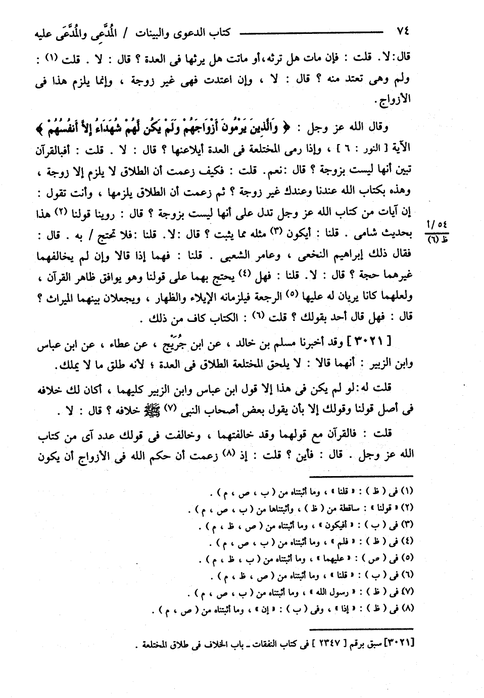 قَالَ لاَ قُلْت فَإِنْ مَاتَ هَلْ تَرِثُهُ , أَوْ مَاتَتْ هَلْ يَرِثُهَا فِي الْعِدَّةِ؟ قَالَ لاَ قُلْت وَلِمَ وَهِيَ تَعْتَدُّ مِنْهُ؟ قَالَ لاَ وَإِنْ اعْتَدَّتْ فَهِيَ غَيْرُ زَوْجَةٍ وَإِنَّمَا يَلْزَمُ هَذَا فِي الْأَزْوَاجِ وَقَالَ اللَّهُ عَزَّ وَجَلَّ: ? وَاَلَّذِينَ يَرْمُونَ أَزْوَاجَهُمْ وَلَمْ يَكُنْ لَهُمْ شُهَدَاءُ إلَّا أَنْفُسُهُمْ ? الآيَةَ. , وَإِذَا رَمَى الْمُخْتَلِعَةَ فِي الْعِدَّةِ أَيُلاَعِنُهَا قَالَ لاَ قُلْت: أَفَبِالْقُرْآنِ تَبَيَّنَ أَنَّهَا لَيْسَتْ بِزَوْجَةٍ قَالَ نَعَمْ قُلْت فَكَيْفَ زَعَمْت أَنَّ الطَّلاَقَ لاَ يَلْزَمُ إلَّا زَوْجَةٌ وَهَذِهِ بِكِتَابِ اللَّهِ تَعَالَى عِنْدَنَا وَعِنْدَك غَيْرُ زَوْجَةٍ , ثُمَّ زَعَمْت أَنَّ الطَّلاَقَ يَلْزَمُهَا وَأَنْتَ تَقُولُ إنَّ آيَاتٍ مِنْ كِتَابِ اللَّهِ عَزَّ وَجَلَّ تَدُلُّ عَلَى أَنَّهَا لَيْسَتْ بِزَوْجَةٍ؟ قَالَ رَوَيْنَا قَوْلَنَا هَذَا بِحَدِيثٍ شَامِيٍّ قُلْنَا أَفَيَكُونُ مِثْلُهُ مِمَّا يَثْبُتُ؟ قَالَ لاَ قُلْنَا فَلاَ تَحْتَجُّ بِهِ قَالَ فَقَالَ ذَلِكَ إبْرَاهِيمُ النَّخَعِيُّ وَعَامِرٌ الشَّعْبِيُّ قُلْنَا فَهُمَا إذَا قَالاَ وَإِنْ لَمْ يُخَالِفْهُمَا غَيْرُهُمَا حُجَّةٌ؟ قَالَ لاَ قُلْنَا فَهَلْ يَحْتَجُّ بِهِمَا عَلَى قَوْلِنَا وَهُوَ يُوَافِقُ ظَاهِرَ الْقُرْآنِ وَلَعَلَّهُمَا كَانَا يَرَيَانِ لَهُ عَلَيْهَا الرَّجْعَةَ فَيُلْزِمَانِهِ الْإِيلاَءَ وَالظِّهَارَ وَيَجْعَلاَنِ بَيْنَهُمَا الْمِيرَاثَ؟ قَالَ فَهَلْ قَالَ أَحَدٌ بِقَوْلِك؟ قُلْنَا الْكِتَابُ كَافٍ مِنْ ذَلِكَ , وَقَدْ أَخْبَرَنَا مُسْلِمُ بْنُ خَالِدٍ عَنْ ابْنِ جُرَيْجٍ عَنْ عَطَاءٍ عَنْ ابْنِ عَبَّاسٍ وَابْنِ الزُّبَيْرِ أَنَّهُمَا قَالاَ لاَ يَلْحَقُ الْمُخْتَلِعَةَ الطَّلاَقُ فِي الْعِدَّةِ ; لِأَنَّهُ طَلَّقَ مَا لاَ يَمْلِكُ قُلْت لَهُ لَوْ لَمْ يَكُنْ فِي هَذَا إلَّا قَوْلُ ابْنُ عَبَّاسٍ وَابْنِ الزُّبَيْرِ كِلَيْهِمَا أَكَانَ لَك خِلاَفُهُ فِي أَصْلِ قَوْلِنَا وَقَوْلِك إلَّا بِأَنْ يَقُولَ بَعْضُ أَصْحَابِ النَّبِيِّ - صلى الله عليه وسلم - خِلاَفَهُ قَالَ لاَ قُلْت فَالْقُرْآنُ مَعَ قَوْلِهِمَا , وَقَدْ خَالَفْتهمَا وَخَالَفْت فِي قَوْلِك عَدَدَ آيٍ مِنْ كِتَابِ اللَّهِ عَزَّ وَجَلَّ قَالَ فَأَيْنَ؟ قُلْت إنْ زَعَمْت أَنَّ حُكْمَ اللَّهِ فِي الْأَزْوَاجِ أَنْ يَكُونَ@