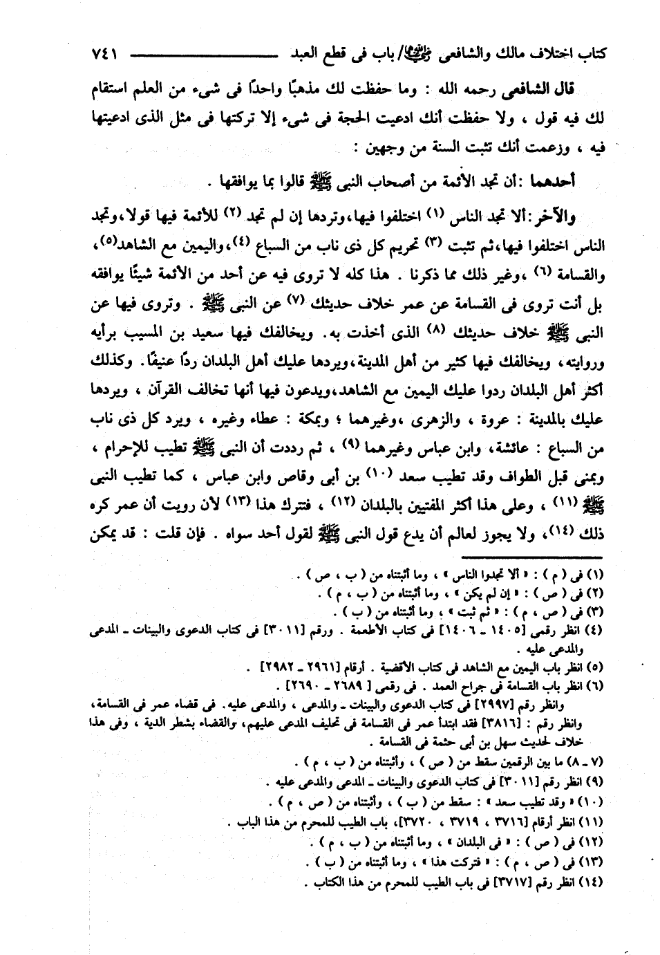 قَالَ الشَّافِعِيُّ : : رحمه الله تعالى وَمَا حَفِظْت لَك مَذْهَبًا وَاحِدًا فِي شَيْءٍ مِنْ الْعِلْمِ اسْتَقَامَ لَك فِيهِ قَوْلٌ وَلاَ حَفِظْت أَنَّك ادَّعَيْت الْحُجَّةَ فِي شَيْءٍ إلَّا تَرَكْتهَا فِي مِثْلِ الَّذِي ادَّعَيْتهَا فِيهِ وَزَعَمْت أَنَّك تُثْبِتُ السُّنَّةَ مِنْ وَجْهَيْنِ : أَحَدُهُمَا أَنْ تَجِدَ الْأَئِمَّةَ مِنْ أَصْحَابِ النَّبِيِّ - صلى الله عليه وسلم - قَالُوا بِمَا يُوَافِقُهَا وَالْآخَرُ أَنْ لاَ تَجِدَ النَّاسَ اخْتَلَفُوا فِيهَا وَتَرُدُّهَا إنْ لَمْ تَجِدْ لِلْأَئِمَّةِ فِيهَا قَوْلاً وَتَجِدْ النَّاسَ اخْتَلَفُوا فِيهَا ثُمَّ تُثْبِتُ تَحْرِيمَ كُلِّ ذِي نَابٍ مِنْ السِّبَاعِ وَالْيَمِينَ مَعَ الشَّاهِدِ وَالْقَسَامَةَ وَغَيْرَ ذَلِكَ مِمَّا ذَكَرْنَا هَذَا كُلُّهُ لاَ تَرْوِي فِيهِ عَنْ أَحَدٍ مِنْ الْأَئِمَّةِ شَيْئًا يُوَافِقُهُ بَلْ أَنْتَ تَرْوِي فِي الْقَسَامَةِ عَنْ عُمَرَ خِلاَفَ حَدِيثِك عَنْ النَّبِيِّ - صلى الله عليه وسلم - وَتَرْوِي فِيهَا عَنْ النَّبِيِّ - صلى الله عليه وسلم - خِلاَفَ حَدِيثِك الَّذِي أَخَذْت بِهِ وَيُخَالِفُك فِيهَا سَعِيدُ بْنُ الْمُسَيِّبِ بِرَأْيِهِ وَرِوَايَتِهِ وَيُخَالِفُك فِيهَا كَثِيرٌ مِنْ أَهْلِ الْمَدِينَةِ وَيَرُدُّهَا عَلَيْك أَهْلُ الْبُلْدَانِ رَدًّا عَنِيفًا وَكَذَلِكَ أَكْثَرُ أَهْلِ الْبُلْدَانِ رَدُّوا عَلَيْك الْيَمِينَ مَعَ الشَّاهِدِ وَيَدَّعُونَ فِيهَا أَنَّهَا تُخَالِفُ الْقُرْآنَ وَيَرُدُّهَا عَلَيْك بِالْمَدِينَةِ عُرْوَةُ وَالزُّهْرِيُّ وَغَيْرُهُمَا وَبِمَكَّةَ عَطَاءٌ وَغَيْرُهُ وَيَرُدُّ كُلَّ ذِي نَابٍ مِنْ السِّبَاعِ عَائِشَةُ وَابْنُ عَبَّاسٍ وَغَيْرُهُمَا ثُمَّ رَدَدْت : ? أَنَّ النَّبِيَّ - صلى الله عليه وسلم - تَطَيَّبَ لِلْإِحْرَامِ وَبِمِنًى قَبْلَ الطَّوَافِ ابْنُ أَبِي وَقَّاصٍ وَابْنُ عَبَّاسٍ كَمَا تَطَيَّبَ النَّبِيُّ - صلى الله عليه وسلم - ? وَعَلَى هَذَا أَكْثَرُ الْمُفْتِينَ بِالْبُلْدَانِ فَتَتْرُكُ هَذَا لاََنْ رَوَيْت أَنَّ عُمَرَ كَرِهَ ذَلِكَ وَلاَ يَجُوزُ لِعَالِمٍ أَنْ يَدَعَ قَوْلَ النَّبِيِّ - صلى الله عليه وسلم - لِقَوْلِ أَحَدٍ سِوَاهُ فَإِنْ قُلْت قَدْ يُمْكِنُ@