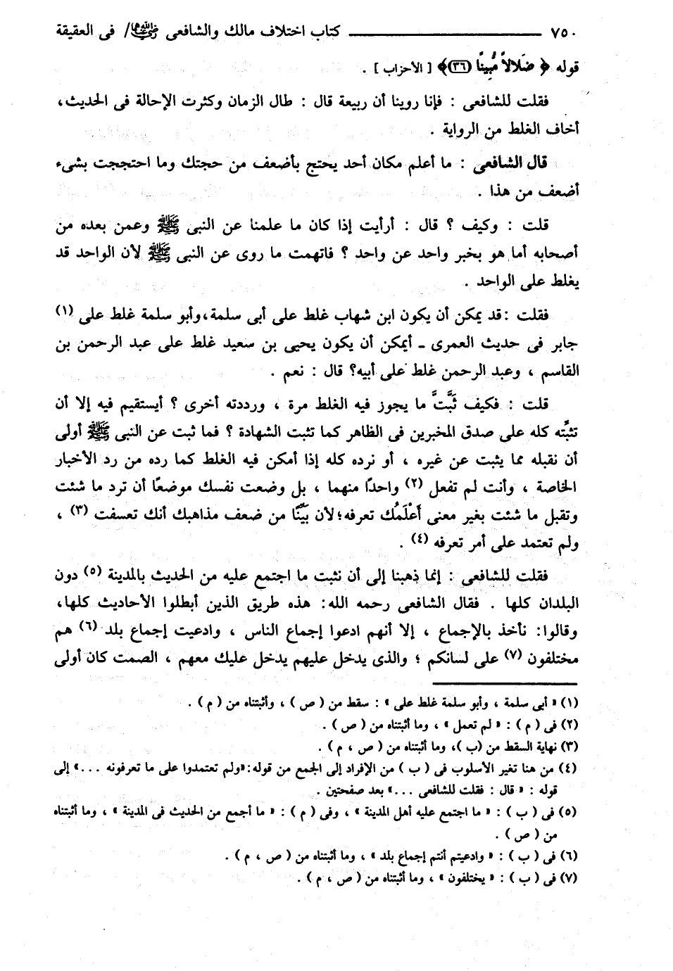 . فَقُلْت لِلشَّافِعِيِّ : إنَّمَا ذَهَبْنَا إلَى أَنْ نُثْبِتَ مَا اجْتَمَعَ عَلَيْهِ أَهْلُ الْمَدِينَةِ دُونَ الْبُلْدَانِ كُلِّهَا فَقَالَ الشَّافِعِيُّ : هَذِهِ طَرِيقُ الَّذِينَ أَبْطَلُوا الْأَحَادِيثَ كُلَّهَا وَقَالُوا نَأْخُذُ بِالْإِجْمَاعِ إلَّا أَنَّهُمْ ادَّعَوْا إجْمَاعَ النَّاسِ وَادَّعَيْتُمْ أَنْتُمْ إجْمَاعَ بَلَدٍ هُمْ يَخْتَلِفُونَ عَلَى لِسَانِكُمْ وَاَلَّذِي يَدْخُلُ عَلَيْهِمْ يَدْخُلُ عَلَيْك مَعَهُمْ لَلصَّمْتُ كَانَ أَوْلَى@