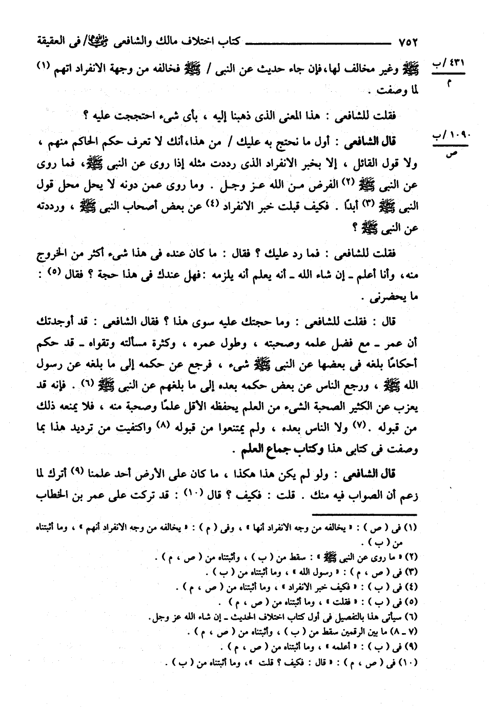 قَالَ الشَّافِعِيُّ : : أَوَّلُ مَا نَحْتَجُّ بِهِ عَلَيْكُمْ مِنْ هَذَا أَنَّكُمْ لاَ تَعْرِفُونَ حُكْمَ الْحَاكِمِ مِنْهُمْ وَلاَ قَوْلَ الْقَائِلِ إلَّا بِخَبَرِ الِانْفِرَادِ الَّذِي رَدَدْتُمْ مِثْلَهُ إذَا رُوِيَ عَنْ النَّبِيِّ - صلى الله عليه وسلم - الْفَرْضُ مِنْ اللَّهِ وَمَا رُوِيَ عَمَّنْ دُونَهُ لاَ يَحِلُّ مَحَلَّ قَوْلِ النَّبِيِّ - صلى الله عليه وسلم - أَبَدًا فَكَيْفَ أَجَزْتُمْ خَبَرَ الِانْفِرَادِ عَنْ بَعْضِ أَصْحَابِ النَّبِيِّ - صلى الله عليه وسلم - وَرَدَدْتُمُوهُ عَنْ النَّبِيِّ - صلى الله عليه وسلم - ؟ فَقُلْت لِلشَّافِعِيِّ : فَمَا رَدَّ عَلَيْك , فَقَالَ : مَا كَانَ عِنْدَهُ فِي هَذَا شَيْءٌ أَكْثَرُ مِنْ الْخُرُوجِ مِنْهُ وَأَنَا أَعْلَمُ - إنْ شَاءَ اللَّهُ - أَنَّهُ يَعْلَمُ أَنَّهُ يَلْزَمُهُ فَهَلْ عِنْدَكُمْ فِي هَذَا حُجَّةٌ ؟ فَقُلْت : مَا يَحْضُرُنِي قَالَ : فَقُلْت لِلشَّافِعِيِّ : وَمَا حُجَّتُك عَلَيْهِ سِوَى هَذَا ؟ فَقَالَ الشَّافِعِيُّ : قَدْ أَوْجَدْتُكُمْ أَنَّ عُمَرَ - مَعَ فَضْلِ عِلْمِهِ وَصُحْبَتِهِ وَطُولِ عُمْرِهِ وَكَثْرَةِ مَسْأَلَتِهِ وَتَقْوَاهُ - قَدْ حَكَمَ أَحْكَامًا بَلَغَهُ بَعْضُهَا عَنْ النَّبِيِّ - صلى الله عليه وسلم - شَيْءٌ فَرَجَعَ عَنْ حُكْمِهِ إلَى مَا بَلَغَهُ عَنْ رَسُولِ اللَّهِ وَرَجَعَ النَّاسُ عَنْ بَعْضِ حُكْمِهِ بَعْدَهُ إلَى مَا بَلَغَهُمْ عَنْ النَّبِيِّ - صلى الله عليه وسلم - فَإِنَّهُ قَدْ يَعْزُبُ عَنْ الْكَثِيرِ الصُّحْبَةِ الشَّيْءُ مِنْ الْعِلْمِ يَحْفَظُهُ الْأَقَلُّ عِلْمًا وَصُحْبَةً مِنْهُ فَلاَ يَمْنَعُهُ ذَلِكَ مِنْ قَبُولِهِ وَاكْتَفَيْت مِنْ تَرْدِيدِ هَذَا بِمَا وَصَفْت فِي كِتَابِ هَذَا وَكِتَابِ جِمَاعِ الْعِلْمِ