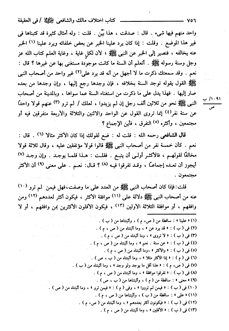 وَاحِدٍ مِنْهُمْ فِيهَا شَيْءٌ قَالَ : صَدَقْت هَذَا بَيِّنٌ قُلْت : وَلَهُ أَمْثَالٌ كَثِيرَةٌ قَدْ كَتَبْنَاهَا فِي غَيْرِ هَذَا الْمَوْضِعِ فَقُلْت : إذَا كَانَ يَرِدُ عَلَيْنَا الْخَبَرُ عَنْ بَعْضِ خُلَفَائِهِ وَيَرِدُ عَلَيْنَا الْخَبَرُ عَنْهُ يُخَالِفُهُ فَنَصِيرَ إلَى الْخَبَرِ عَنْ النَّبِيِّ - صلى الله عليه وسلم - لِأَنَّ لِكُلٍّ غَايَةً وَغَايَةُ الْعِلْمِ كِتَابُ اللَّهِ عَزَّ وَجَلَّ وَسُنَّةُ رَسُولِهِ - صلى الله عليه وسلم - أَتَعْلَمُ أَنَّ السُّنَّةَ مَا كَانَتْ مَوْجُودَةً مُسْتَغْنًى بِهَا عَنْ غَيْرِهَا ؟ قَالَ : نَعَمْ وَقَدْ سَمِعْتُك ذَكَرْت مَا لاَ أَجْهَلُ مِنْ أَنَّهُ قَدْ يَرِدُ عَنْ غَيْرِ وَاحِدٍ مِنْ أَصْحَابِ النَّبِيِّ - صلى الله عليه وسلم - الْقَوْلُ يَقُولُهُ تُوجَدُ السُّنَّةُ بِخِلاَفِهِ فَإِنْ وَجَدَهَا مَنْ بَعْدَهُ صَارَ إلَيْهَا فَهَذَا يَدُلُّ عَلَى مَا ذَكَرْت مِنْ اسْتِغْنَاءِ السُّنَّةِ عَمَّا سِوَاهَا وَبِالْمَدِينَةِ مِنْ أَصْحَابِ النَّبِيِّ - صلى الله عليه وسلم - نَحْوٌ مِنْ ثَلاَثِينَ أَلْفَ رَجُلٍ إنْ لَمْ يَزِيدُوا لَعَلَّك لاَ تَرْوِي عَنْهُمْ قَوْلاً وَاحِدًا عَنْ سِتَّةٍ : نَعَمْ إنَّمَا تَرْوِي الْقَوْلَ عَنْ الْوَاحِدِ وَالِاثْنَيْنِ وَالثَّلاَثَةِ وَالْأَرْبَعَةِ مُتَفَرِّقِينَ فِيهِ أَوْ مُجْتَمِعِينَ وَالْأَكْثَرُ التَّفَرُّقُ فَأَيْنَ الْإِجْمَاعُ