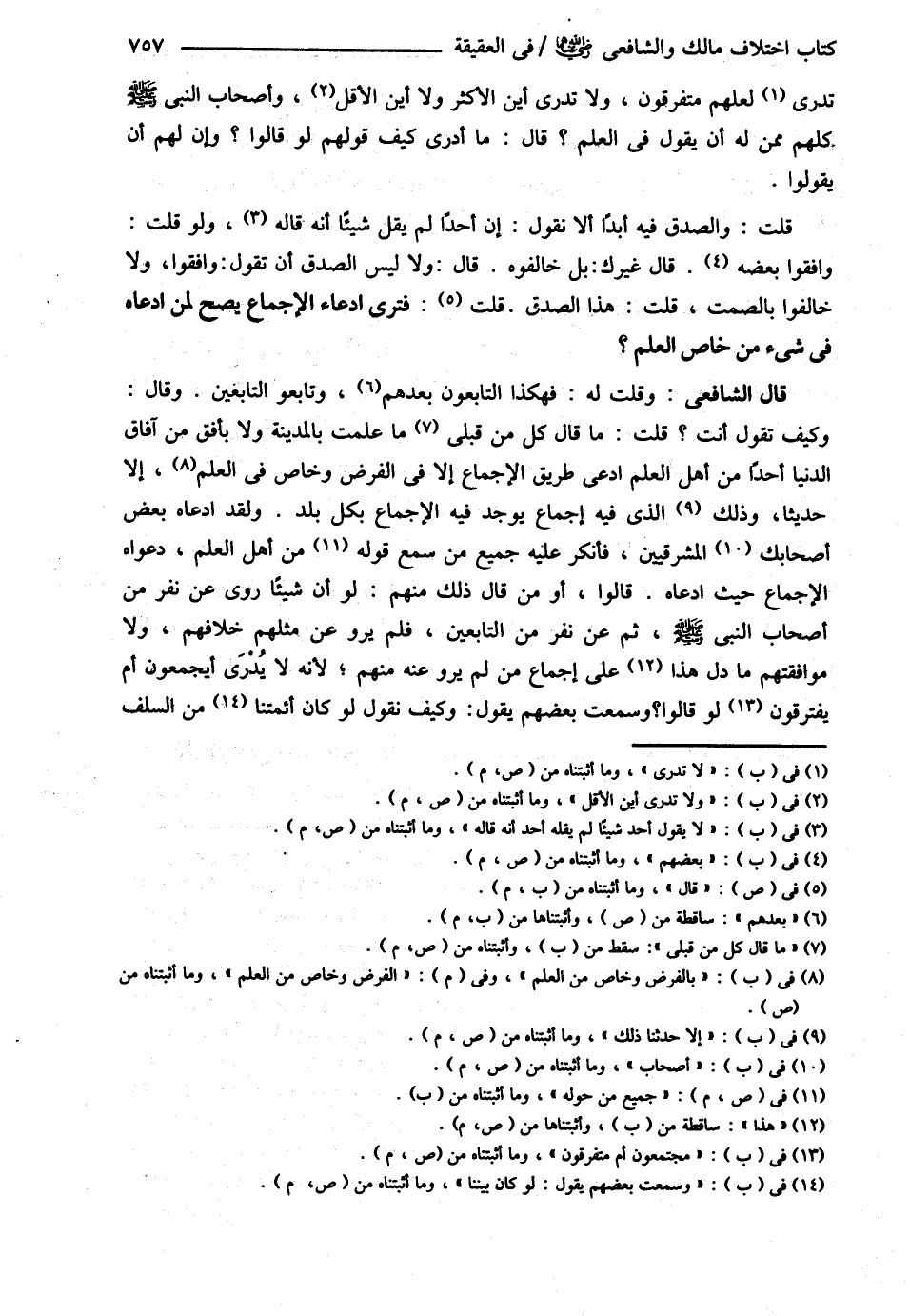 قَالَ الشَّافِعِيُّ : : وَقُلْت لَهُ فَهَكَذَا التَّابِعُونَ بَعْدَهُمْ وَتَابِعُو التَّابِعِينَ وَقَالَ : وَكَيْفَ تَقُولُ أَنْتَ ؟ قُلْت : مَا عَلِمْت بِالْمَدِينَةِ وَلاَ بِأُفُقٍ مِنْ آفَاقِ الدُّنْيَا أَحَدًا مِنْ أَهْلِ الْعِلْمِ ادَّعَى طَرِيقَ الْإِجْمَاعِ إلَّا بِالْفَرْضِ وَخَاصٍّ مِنْ الْعِلْمِ إلَّا حَدَّثَنَا ذَلِكَ الَّذِي فِيهِ إجْمَاعٌ يُوجَدُ فِيهِ الْإِجْمَاعُ بِكُلِّ بَلَدٍ وَلَقَدْ ادَّعَاهُ بَعْضُ أَصْحَابِ الْمَشْرِقِيِّينَ فَأَنْكَرَ عَلَيْهِ جَمِيعُ مَنْ سَمِعَ قَوْلَهُ مِنْ أَهْلِ الْعِلْمِ دَعْوَاهُ الْإِجْمَاعَ حَيْثُ ادَّعَاهُ وَقَالُوا : أَوَمَنْ قَالَ ذَلِكَ مِنْهُمْ لَوْ أَنَّ شَيْئًا رُوِيَ عَنْ نَفَرٍ مِنْ أَصْحَابِ النَّبِيِّ - صلى الله عليه وسلم - ثُمَّ عَنْ نَفَرٍ مِنْ التَّابِعِينَ فَلَمْ يُرْوَ عَنْ مِثْلِهِمْ خِلاَفُهُمْ وَلاَ مُوَافَقَتُهُمْ مَا دَلَّ عَلَى إجْمَاعِ مَنْ لَمْ يُرْوَ عَنْهُ مِنْهُمْ لِأَنَّهُ لاَ يَدْرِي مُجْتَمِعُونَ أَمْ مُفْتَرِقُونَ لَوْ قَالُوا : وَسَمِعْت بَعْضَهُمْ يَقُولُ لَوْ كَانَ بَيْنَنَا مِنْ السَّلَفِ@