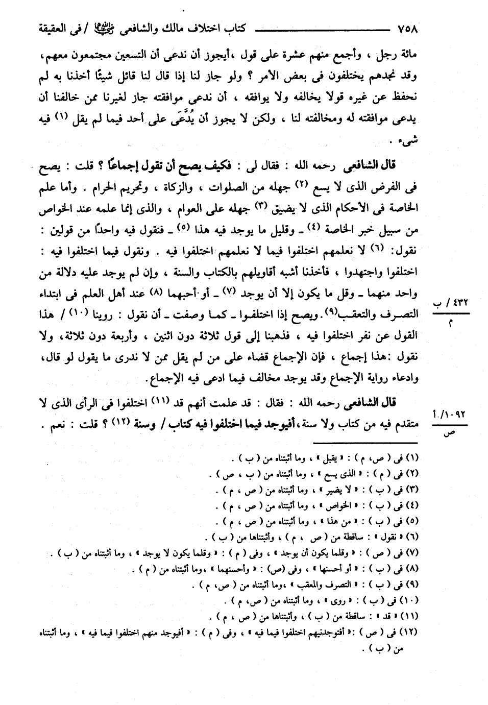 قَالَ الشَّافِعِيُّ : : رحمه الله فَقَالَ لِي : فَكَيْفَ يَصِحُّ أَنْ تَقُولَ إجْمَاعًا ؟ قُلْت : يَصِحُّ فِي الْفَرْضِ الَّذِي لاَ يَسَعُ جَهْلُهُ مِنْ الصَّلَوَاتِ وَالزَّكَاةِ وَتَحْرِيمِ الْحَرَامِ وَأَمَّا عِلْمُ الْخَاصَّةِ فِي الْأَحْكَامِ الَّذِي لاَ يَضِيرُ جَهْلُهُ عَلَى الْعَوَامّ وَاَلَّذِي إنَّمَا عِلْمُهُ عِنْدَ الْخَوَاصِّ مِنْ سَبِيلِ خَبَرِ الْخَوَاصِّ وَقَلِيلٌ مَا يُوجَدُ مِنْ هَذَا فَنَقُولُ فِيهِ وَاحِدًا مِنْ قَوْلَيْنِ نَقُولُ : لاَ نَعْلَمُهُمْ اخْتَلَفُوا فِيمَا لاَ نَعْلَمُهُمْ اخْتَلَفُوا فِيهِ وَنَقُولُ فِيمَا اخْتَلَفُوا فِيهِ اخْتَلَفُوا وَاجْتَهَدُوا فَأَخَذْنَا أَشْبَهَ أَقَاوِيلِهِمْ بِالْكِتَابِ وَالسُّنَّةِ وَإِنْ لَمْ يُوجَدْ عَلَيْهِ دَلاَلَةٌ مِنْ وَاحِدٍ مِنْهُمَا وَقَلَّمَا يَكُونُ إلَّا أَنْ يُوجَدَ أَوْ أَحْسَنُهَا عِنْدَ أَهْلِ الْعِلْمِ فِي ابْتِدَاءِ التَّصَرُّفِ وَالْمُعَقِّبِ وَيَصِحُّ إذَا اخْتَلَفُوا كَمَا وَصَفْت أَنْ نَقُولَ رُوِيَ هَذَا الْقَوْلُ عَنْ نَفَرٍ اخْتَلَفُوا فِيهِ فَذَهَبْنَا إلَى قَوْلِ ثَلاَثَةٍ دُونَ اثْنَيْنِ وَأَرْبَعَةٍ دُونَ ثَلاَثَةٍ وَلاَ نَقُولُ هَذَا إجْمَاعٌ فَإِنَّ الْإِجْمَاعَ قَضَاءٌ عَلَى مَنْ لَمْ يَقُلْ مِمَّنْ لاَ نَدْرِي مَا يَقُولُ لَوْ قَالَ : وَادِّعَاءُ رِوَايَةِ الْإِجْمَاعِ وَقَدْ يُوجَدُ مُخَالِفٌ فِيمَا ادَّعَى فِيهِ الْإِجْمَاعَ