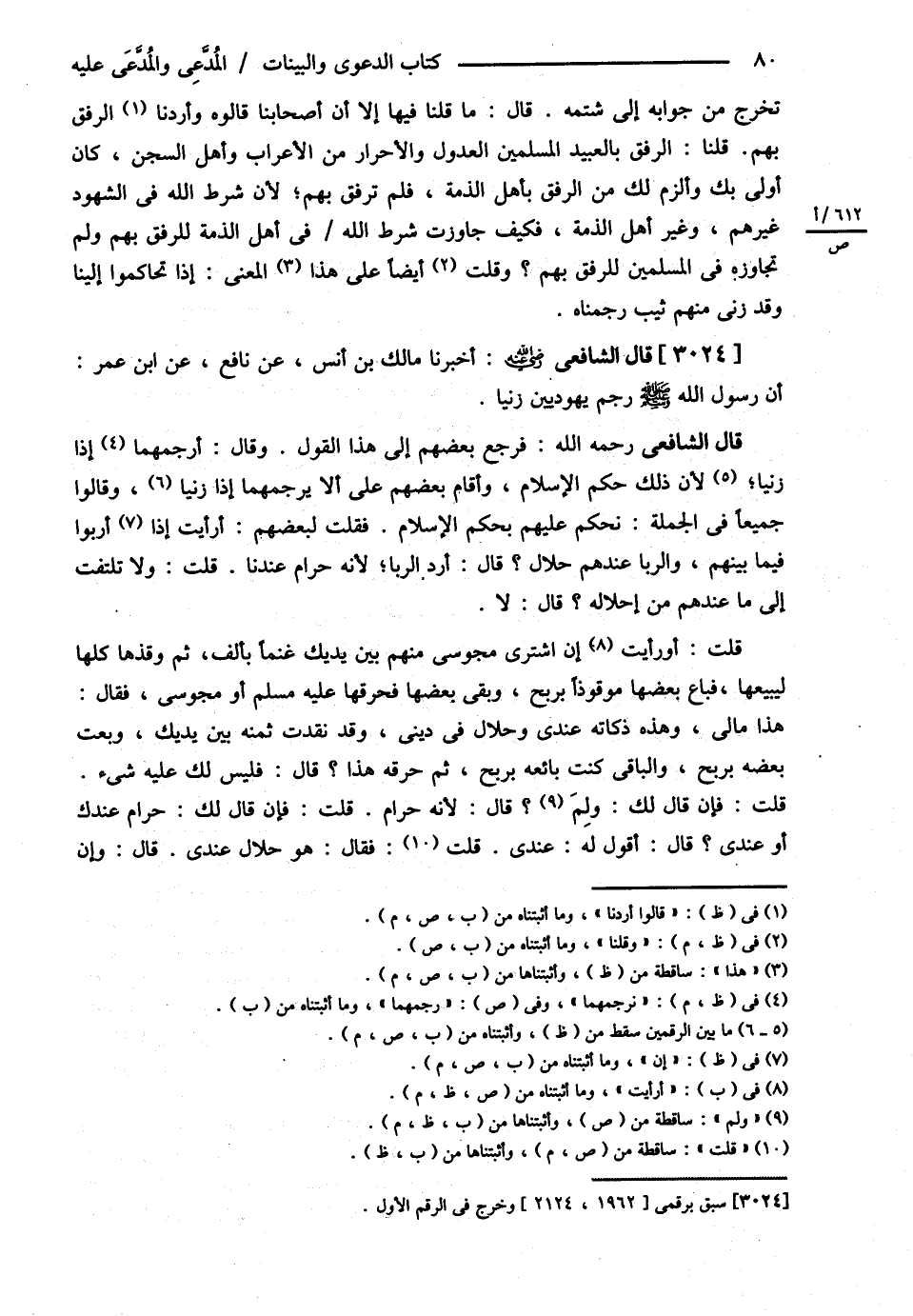 قَالَ الشَّافِعِيُّ : رحمه الله تعالى : فَرَجَعَ بَعْضُهُمْ إلَى هَذَا الْقَوْلِ وَقَالَ أَرْجُمُهُمَا إذَا زَنَيَا ; لِأَنَّ ذَلِكَ حُكْمُ الْإِسْلاَمِ وَأَقَامَ بَعْضُهُمْ عَلَى أَنْ لاَ يَرْجُمُهُمَا إذَا زَنَيَا وَقَالُوا جَمِيعًا فِي الْجُمْلَةِ نَحْكُمُ عَلَيْهِمْ بِحُكْمِ الْإِسْلاَمِ فَقُلْت لِبَعْضِهِمْ أَرَأَيْت إذَا أَرْبَوْا فِيمَا بَيْنَهُمْ وَالرِّبَا عِنْدَهُمْ حَلاَلٌ ؟ قَالَ أَرُدُّ الرِّبَا ; لِأَنَّهُ حَرَامٌ عِنْدَنَا قُلْت وَلاَ تَلْتَفِتُ إلَى مَا عِنْدَهُمْ مِنْ إحْلاَلِهِ ؟ قَالَ لاَ قُلْت أَرَأَيْت إنْ اشْتَرَى مَجُوسِيٌّ مِنْهُمْ بَيْنَ يَدَيْك غَنَمًا بِأَلْفٍ , ثُمَّ وَقَذَهَا كُلَّهَا لِيَبِيعَهَا فَبَاعَ بَعْضَهَا مَوْقُوذًا بِرِبْحٍ وَبَقِيَ بَعْضُهَا فَحَرَقَهَا عَلَيْهِ مُسْلِمٌ , أَوْ مَجُوسِيٌّ فَقَالَ هَذَا مَالِي وَهَذِهِ ذَكَاتُهُ عِنْدِي وَحَلاَلٌ فِي دِينِي , وَقَدْ نَقَدْت ثَمَنَهُ بَيْنَ يَدَيْك وَبِعْت بَعْضَهُ بِرِبْحٍ , وَالْبَاقِي كُنْت بَائِعَهُ بِرِبْحٍ , ثُمَّ حَرَقَهُ هَذَا ؟ قَالَ فَلَيْسَ لَك عَلَيْهِ شَيْءٌ قُلْت فَإِنْ قَالَ لَكَ : وَلِمَ ؟ قَالَ : لِأَنَّهُ حَرَامٌ , قُلْتُ : فَإِنْ قَالَ لَكَ : حَرَامٌ عِنْدَكَ أَوْ عِنْدِي ؟ قَالَ : أَقُولُ لَهُ : عِنْدِي , قُلْتُ : فَقَالَ : هُوَ حَلاَلٌ عِنْدِي , قَالَ : وَإِنْ @
